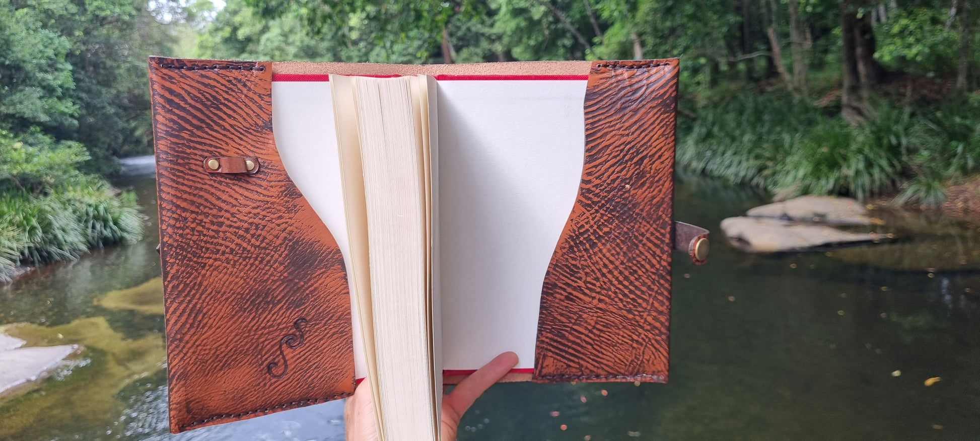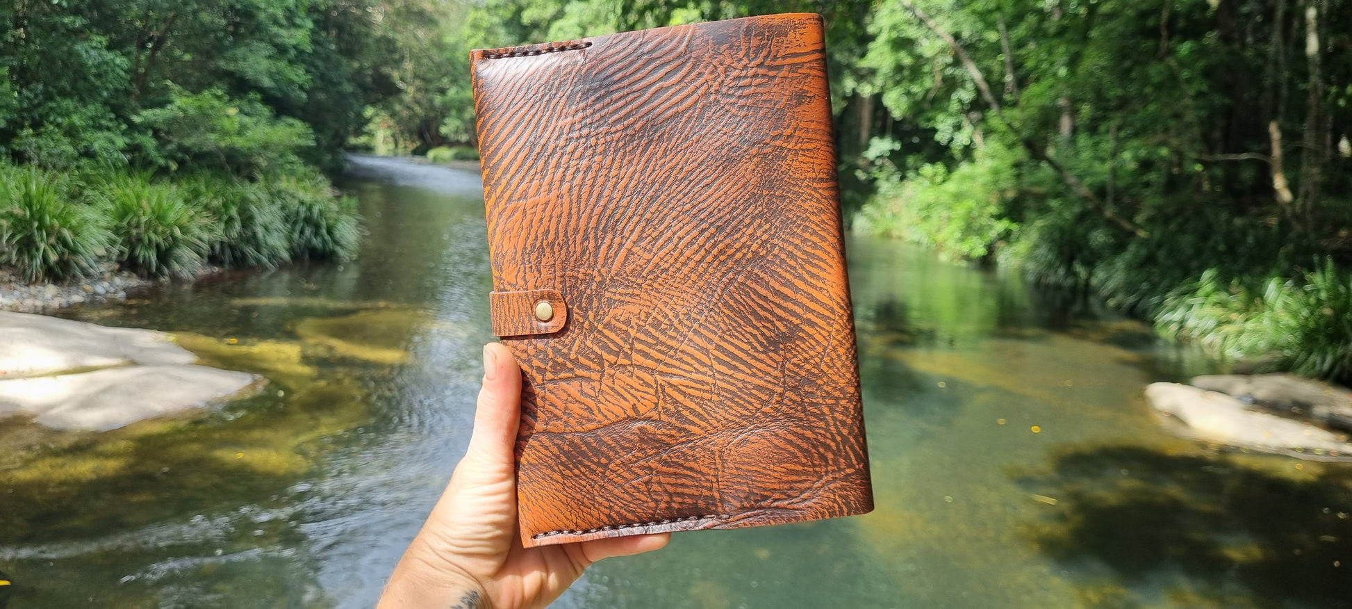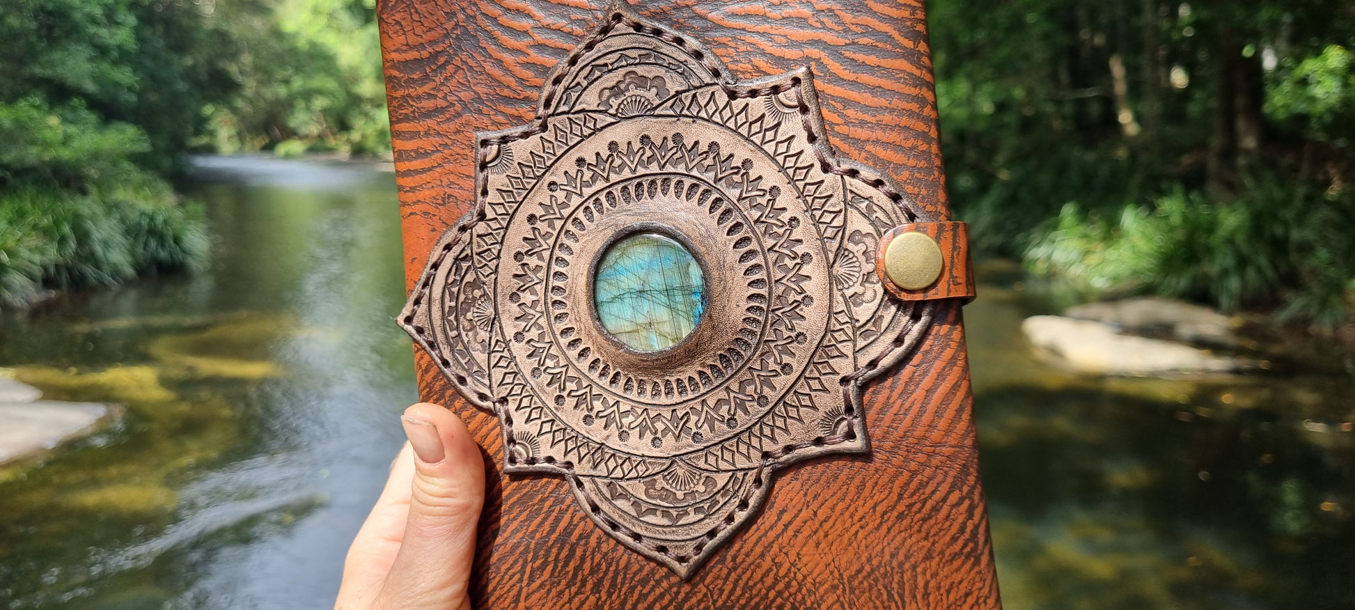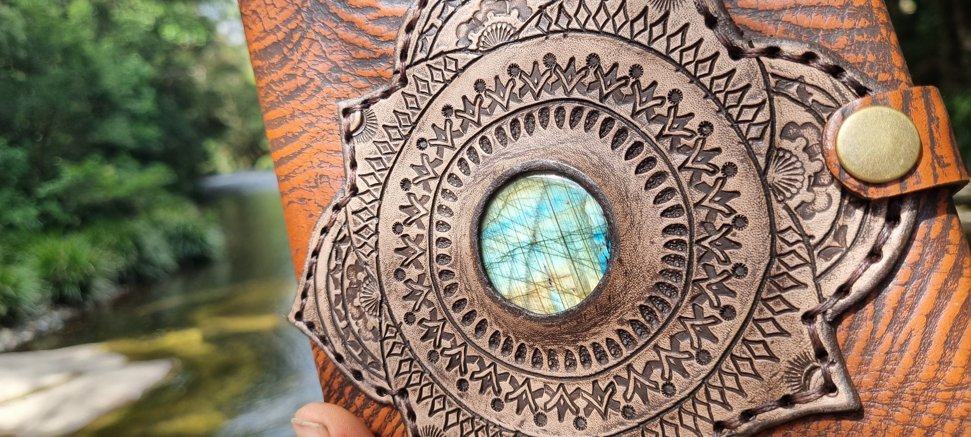 Unique leather journal cover handmade by me in Bellingen. Hand carved, stamped and dyed design on front featuring Labrodorite set in the middle. Cover is removable allowing use on multiple books. A5 size. Comes with book.