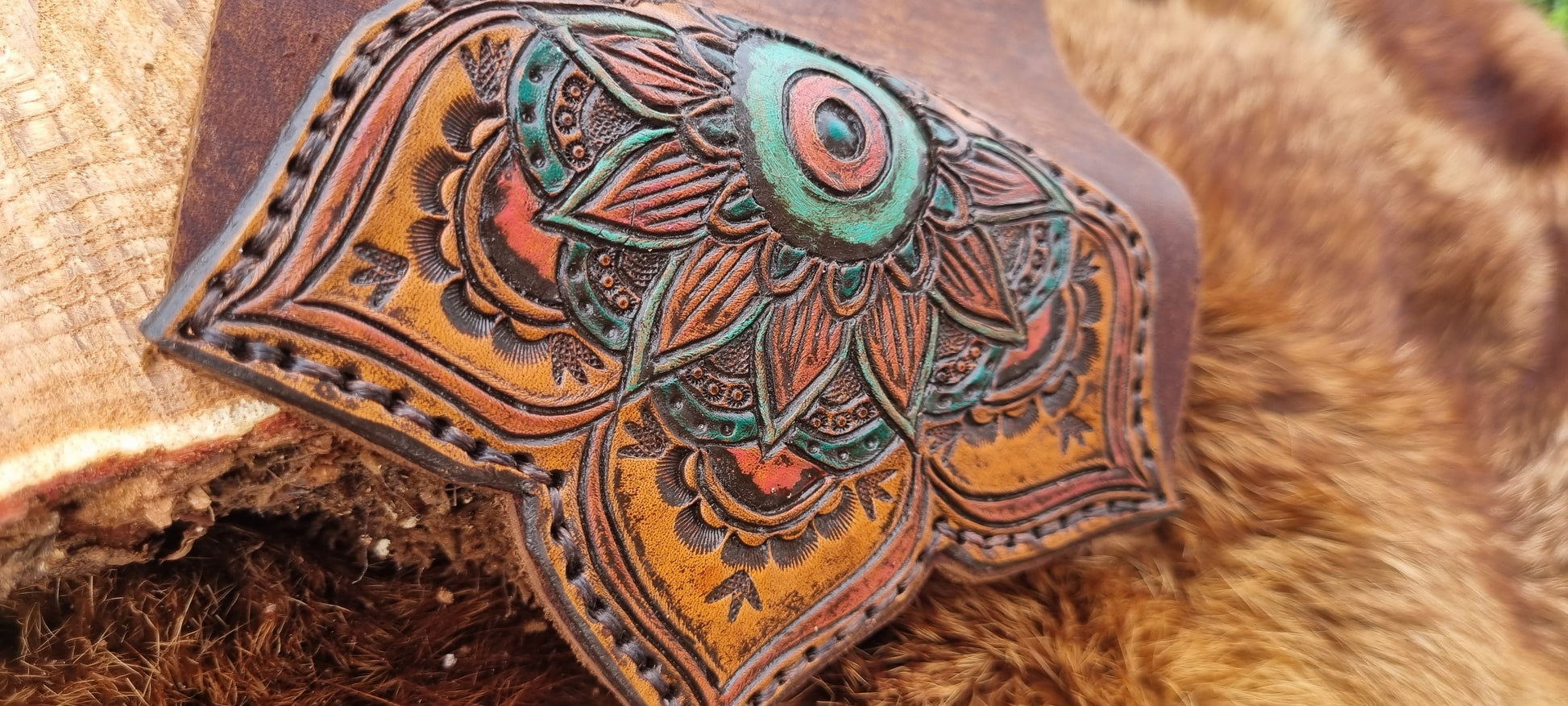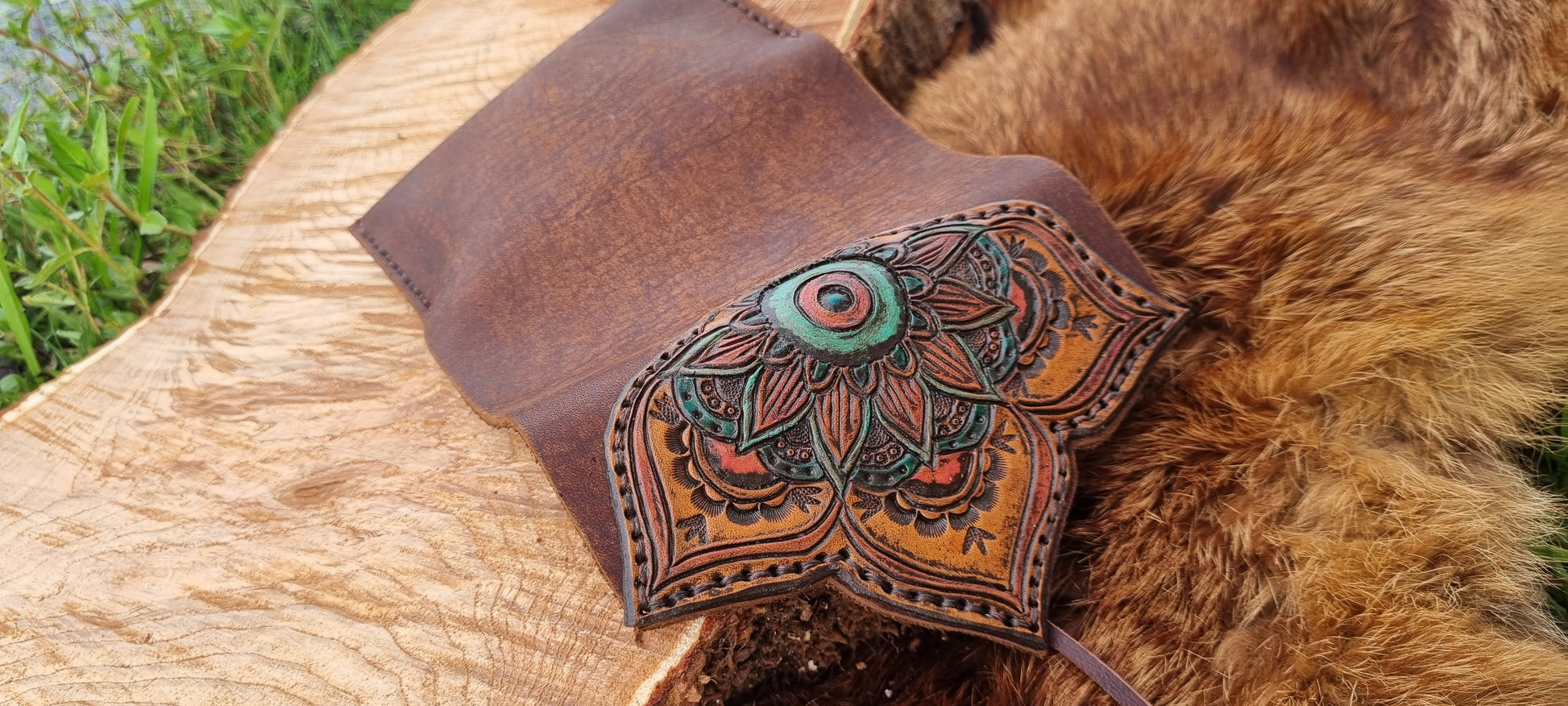 Featuring a hand-carved, painted, and dyed flower mandala, this rolling tobacco pouch is both functional and stylish. It includes a separate paper pocket and a dedicated section for filters, ensuring that all your rolling essentials are neatly stored and easily accessible.