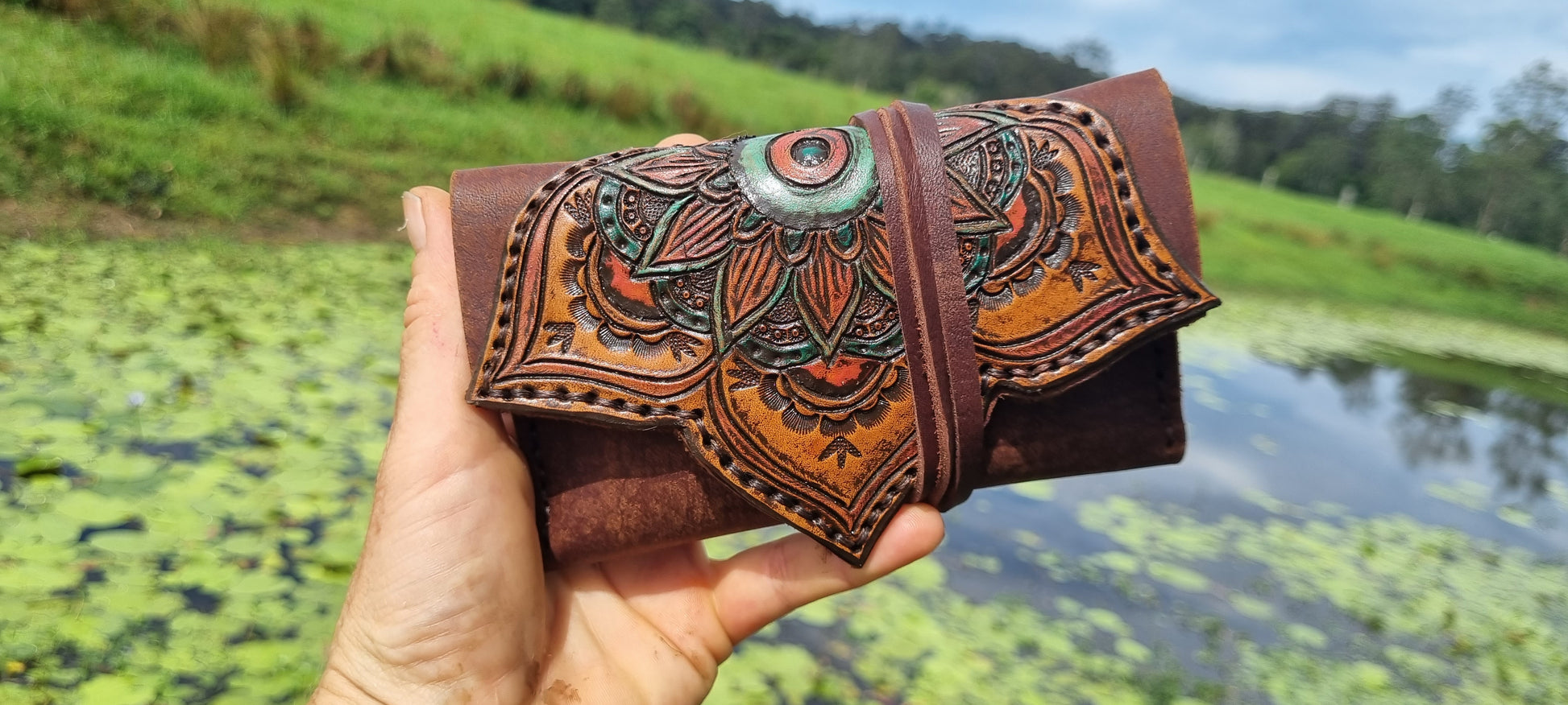 - Intricate Hand-Carved & Stamped Artwork – The pouch is meticulously hand-carved and stamped, creating a deep, detailed flower mandala design that adds a unique and artistic touch.