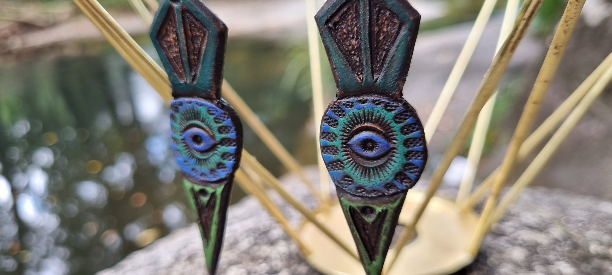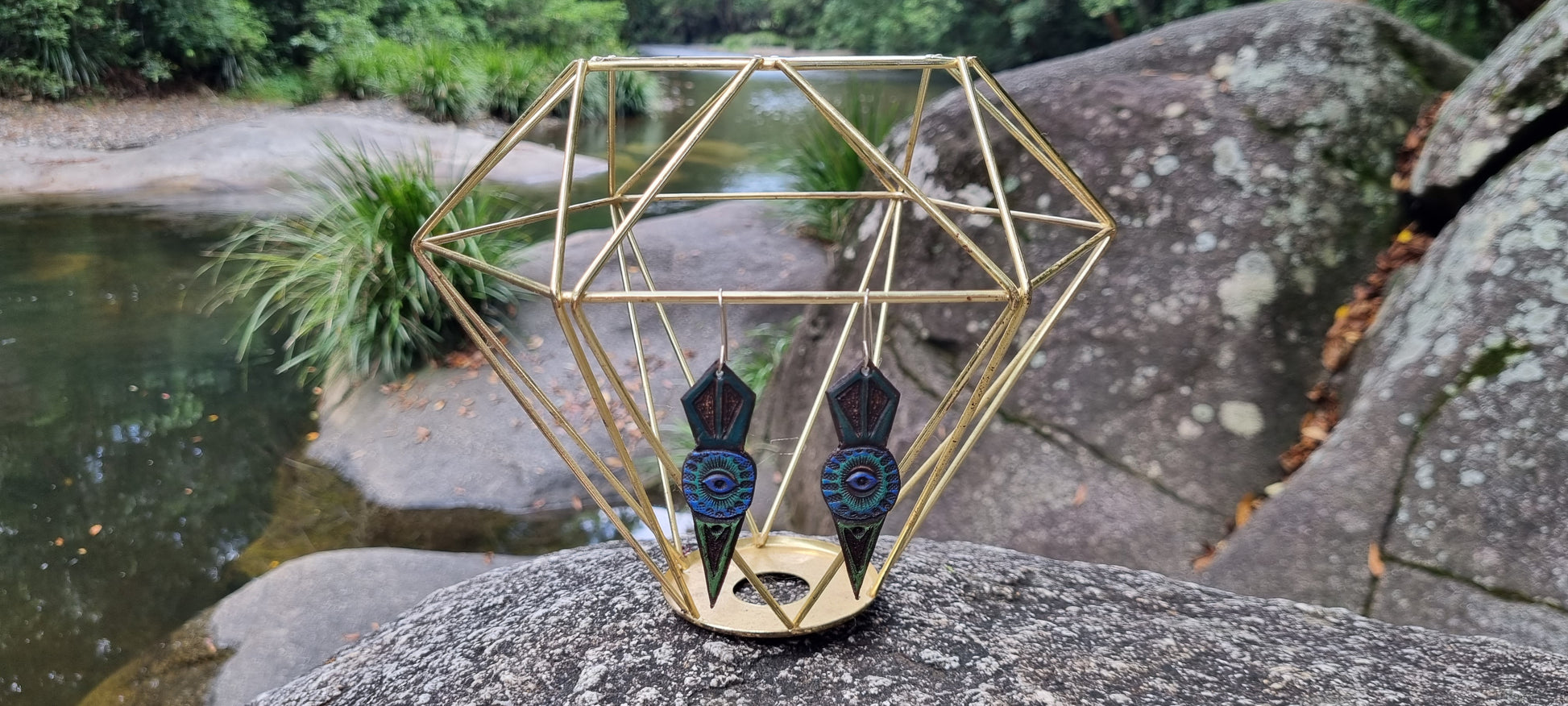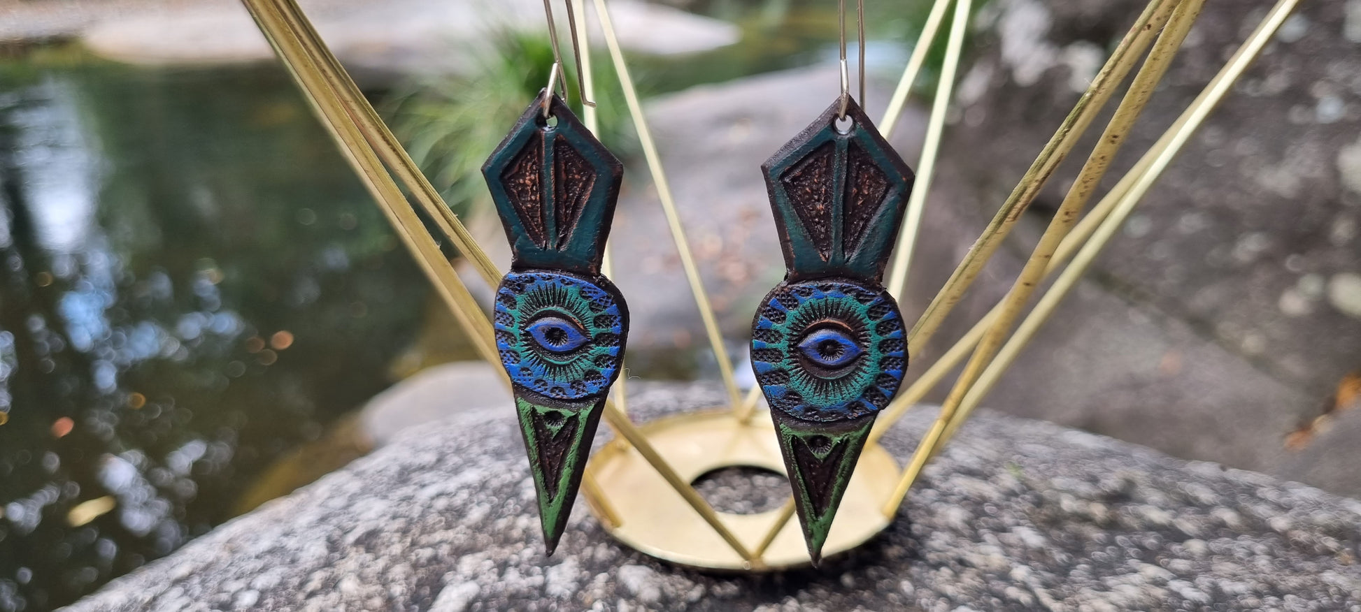 Leather earrings handmade by me in Bellingen. Patterns are hand stamped, painted and dyed. Sterling silver ear hooks.