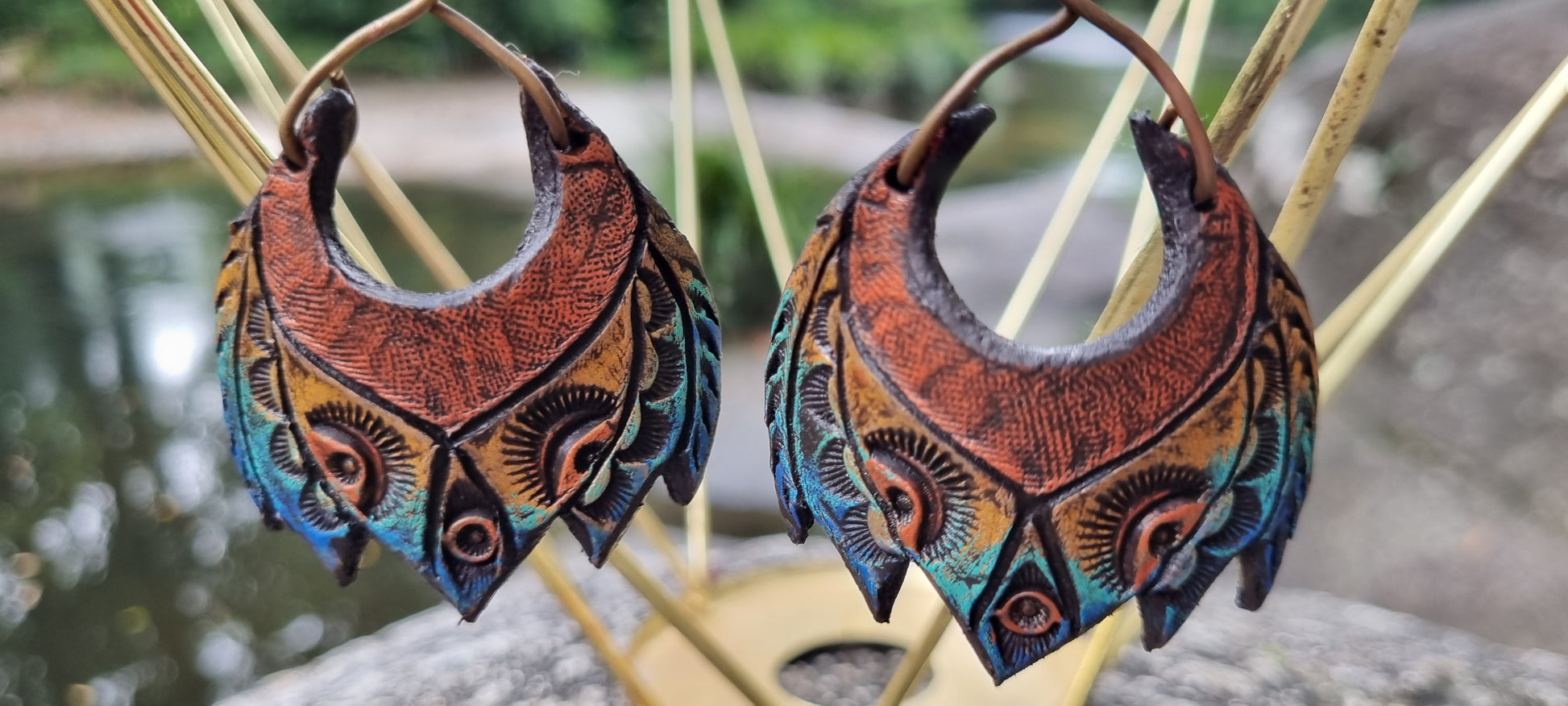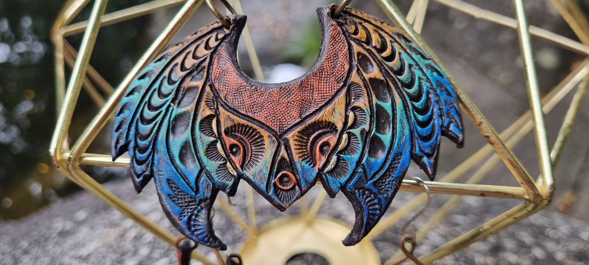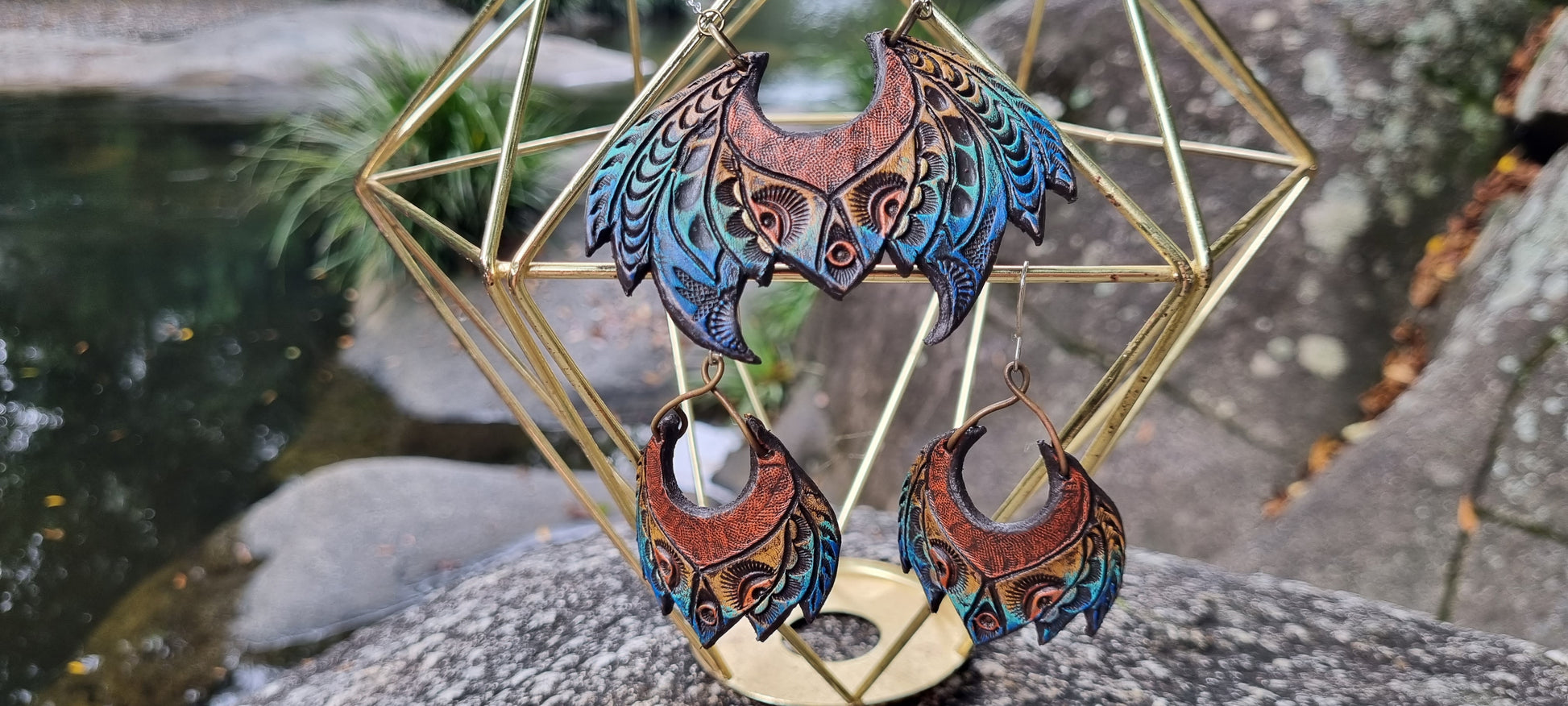 Matching leather earrings and necklace handmade by me in Bellingen. Patterns are hand stamped, painted and dyed. Sterling silver ear hooks.