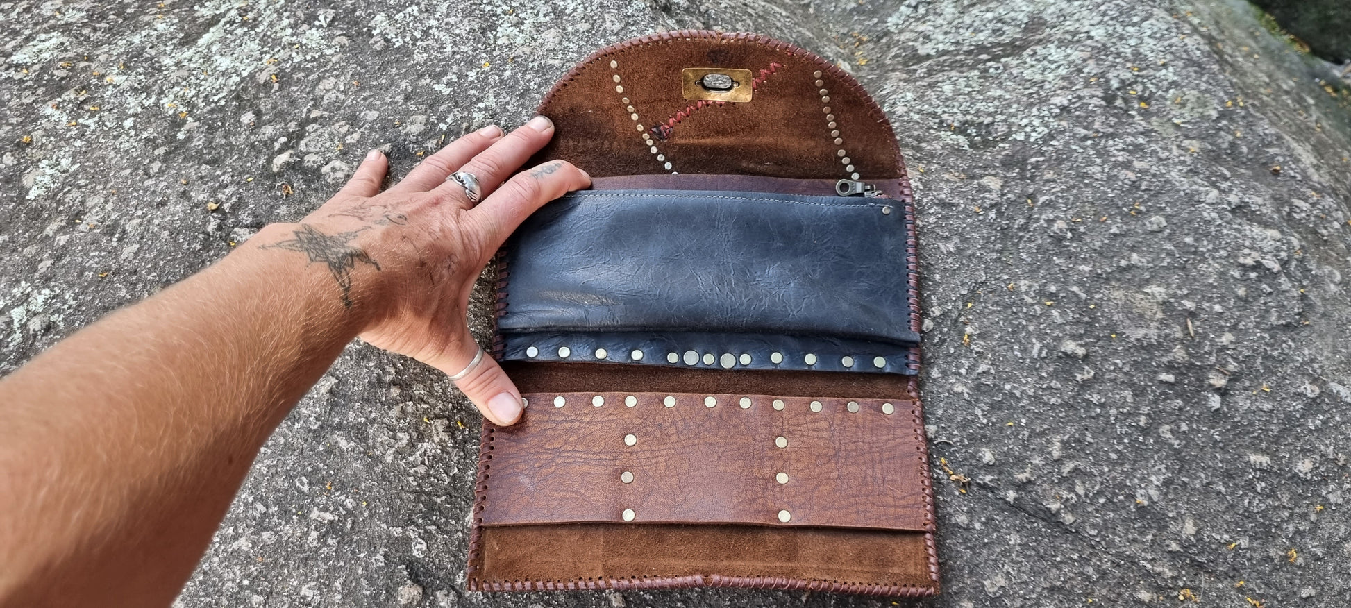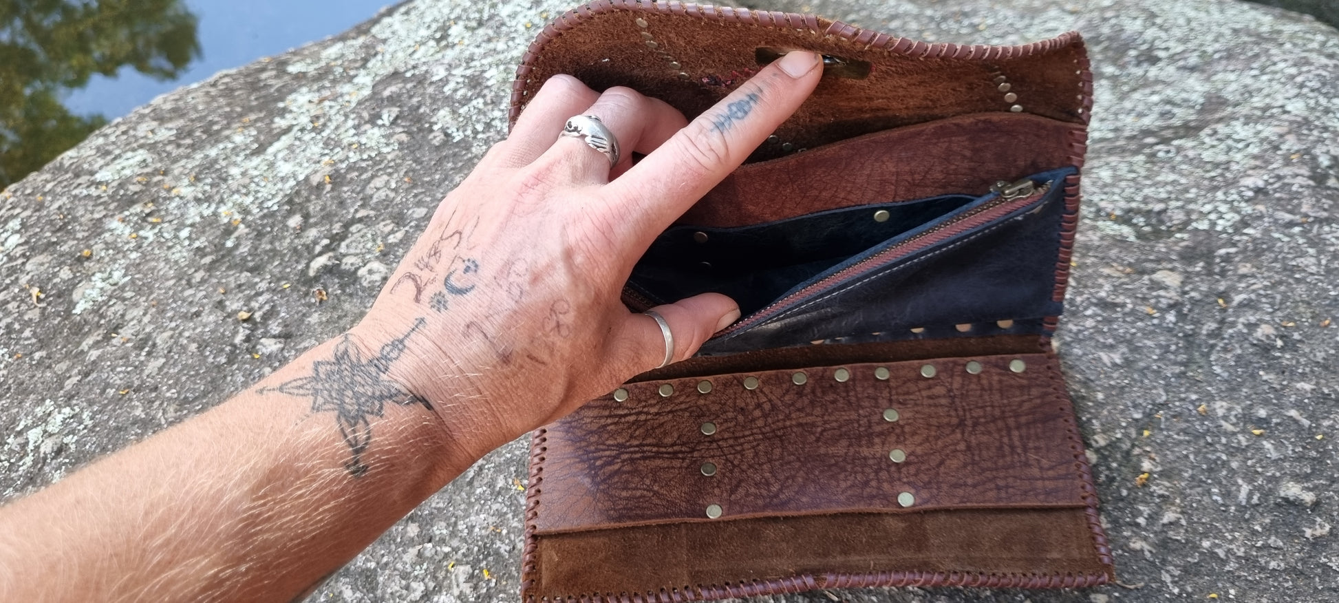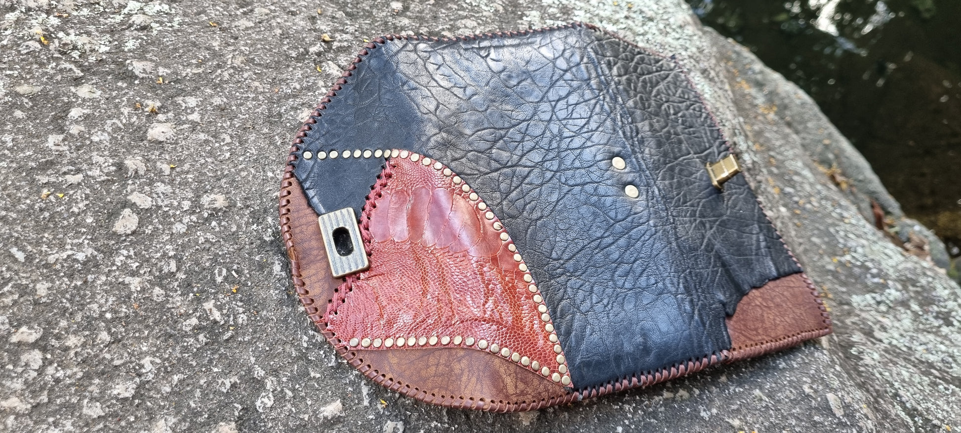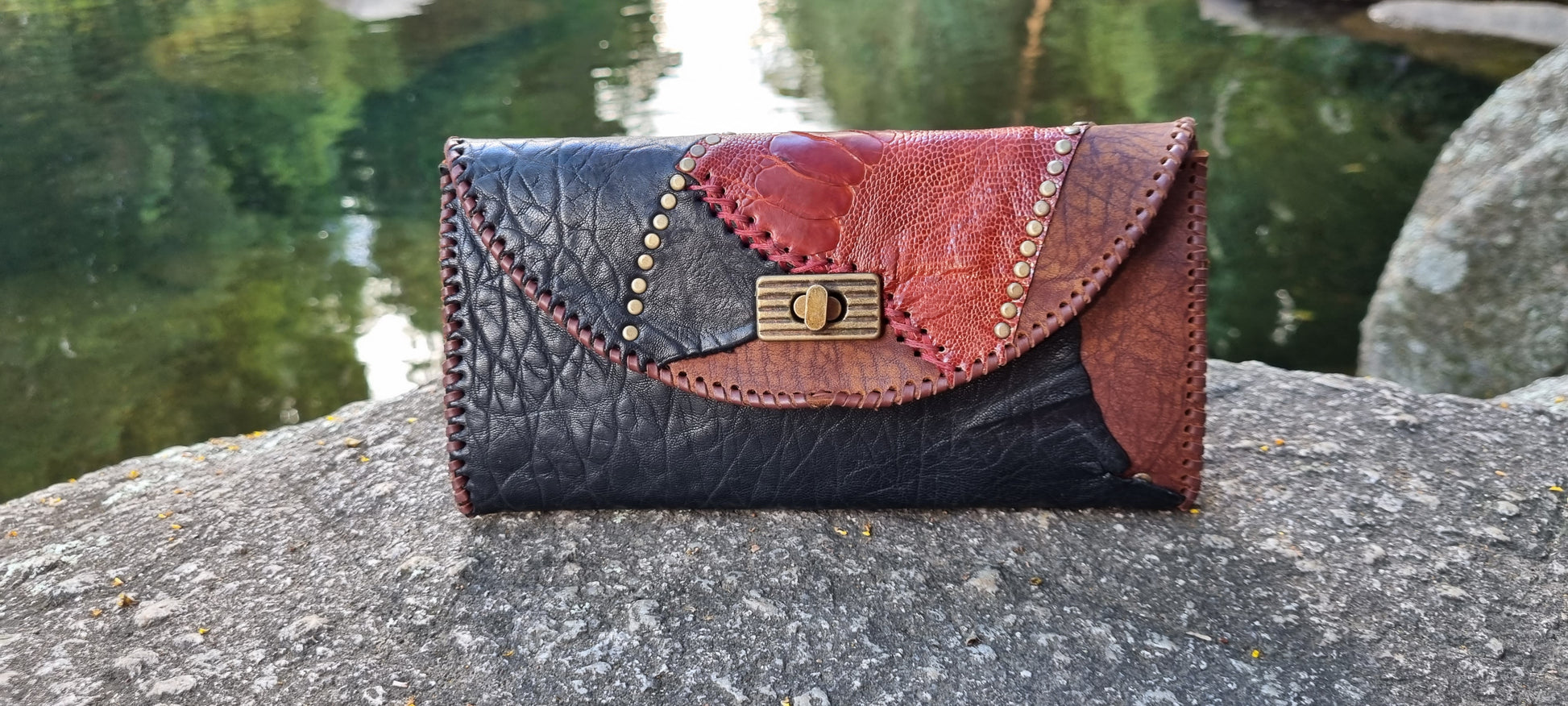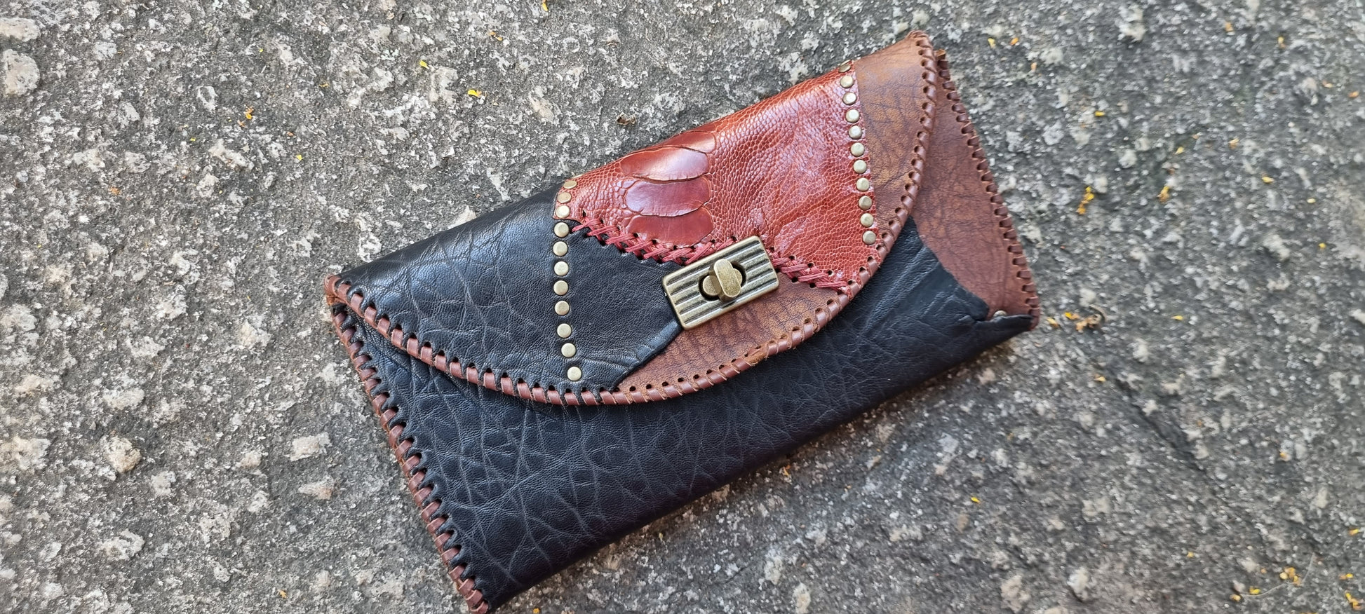 Handmade leather purse made by me in bellingen. Hand stitched design featuring Emu and sheep leather on front. Thick quality long lasting leather. Six card holders, note section, zip up coin pouch, and bronze clasp.