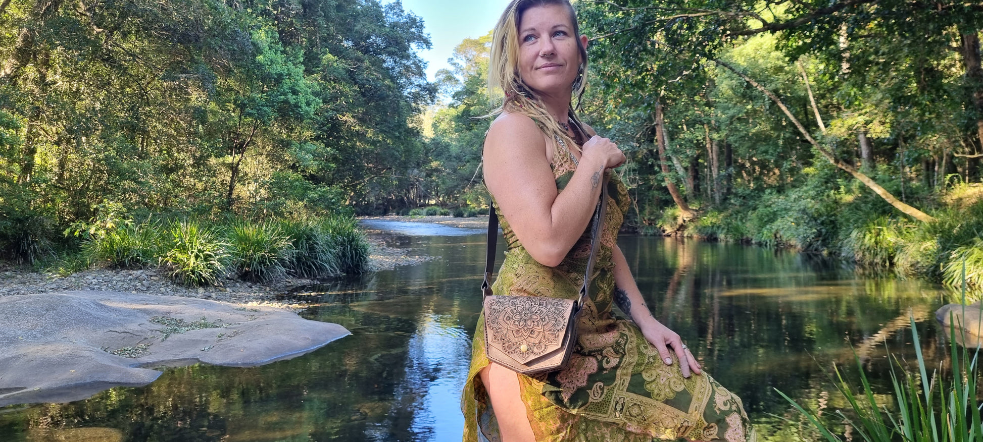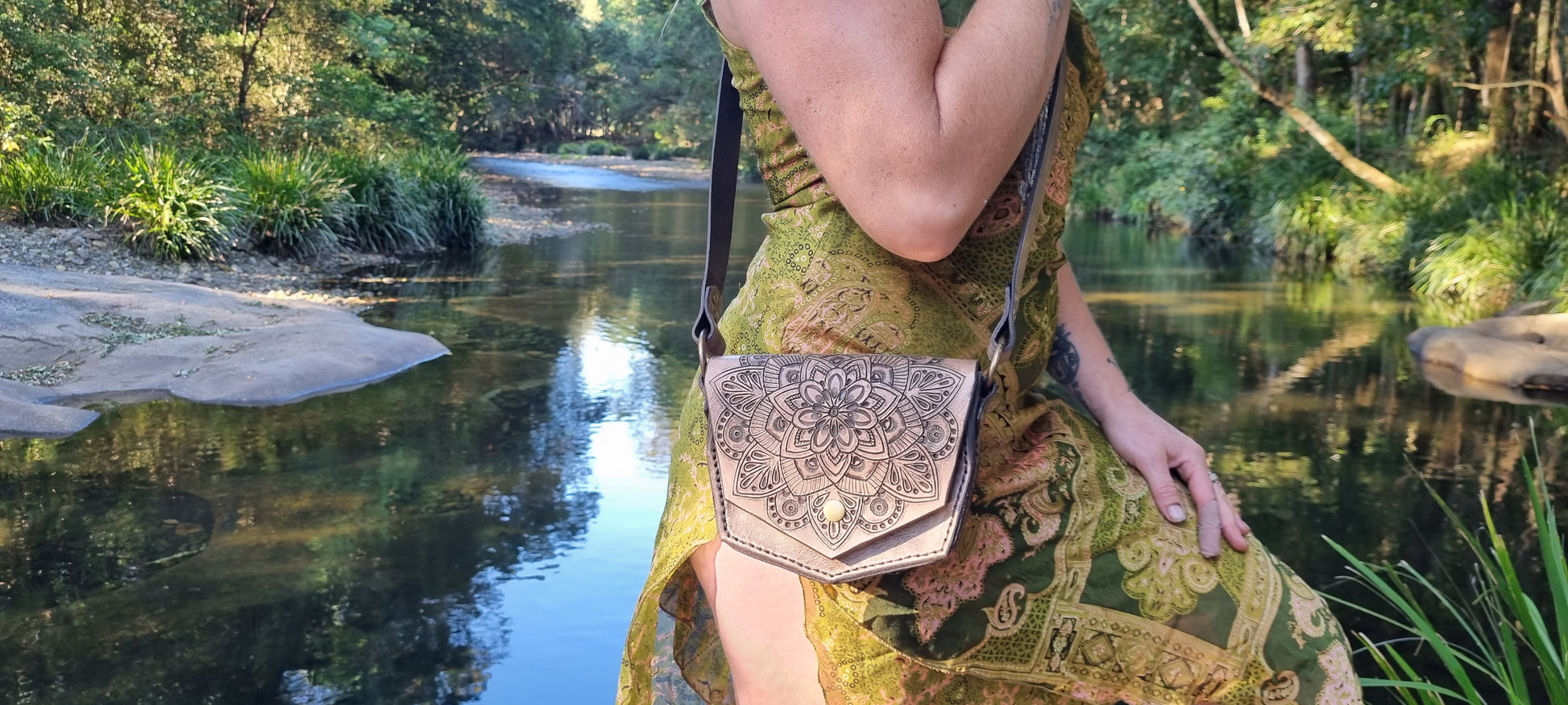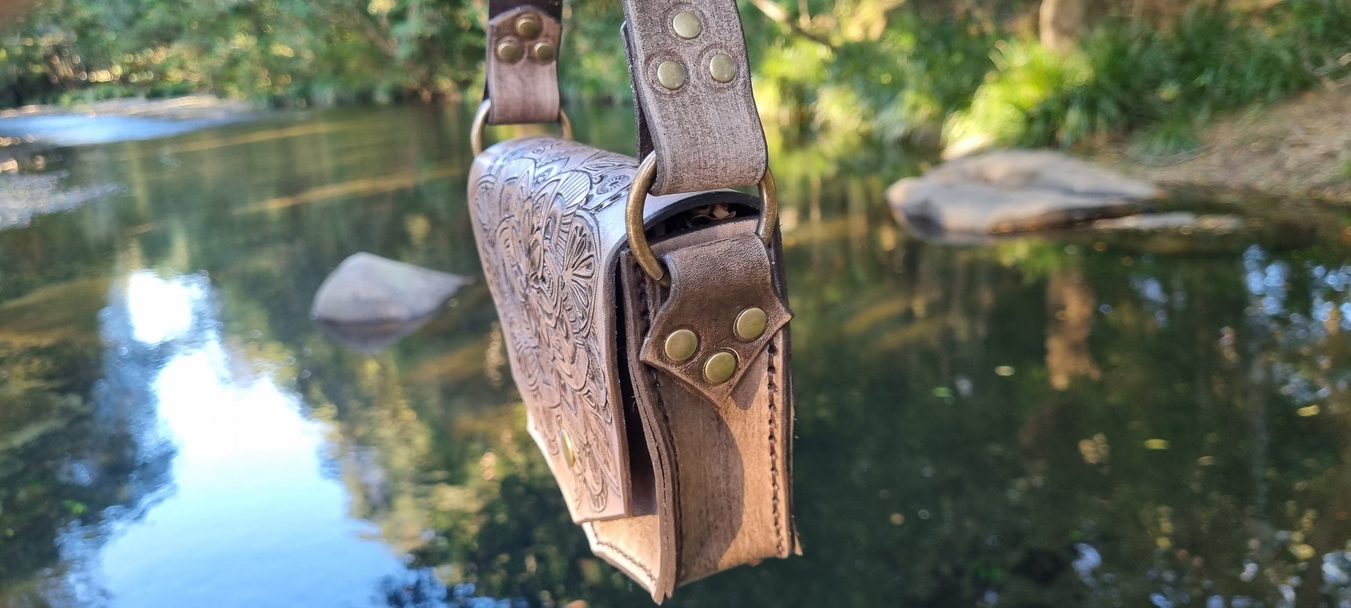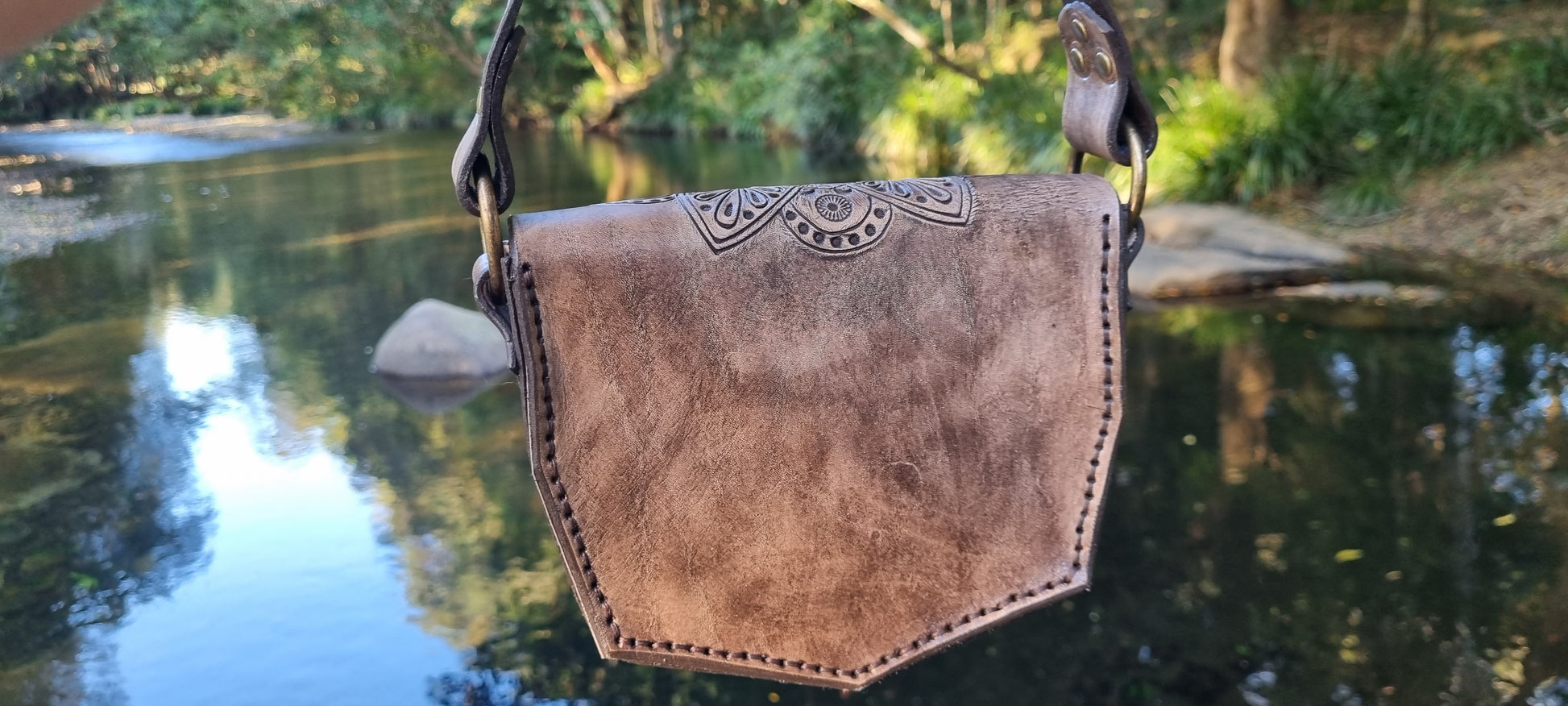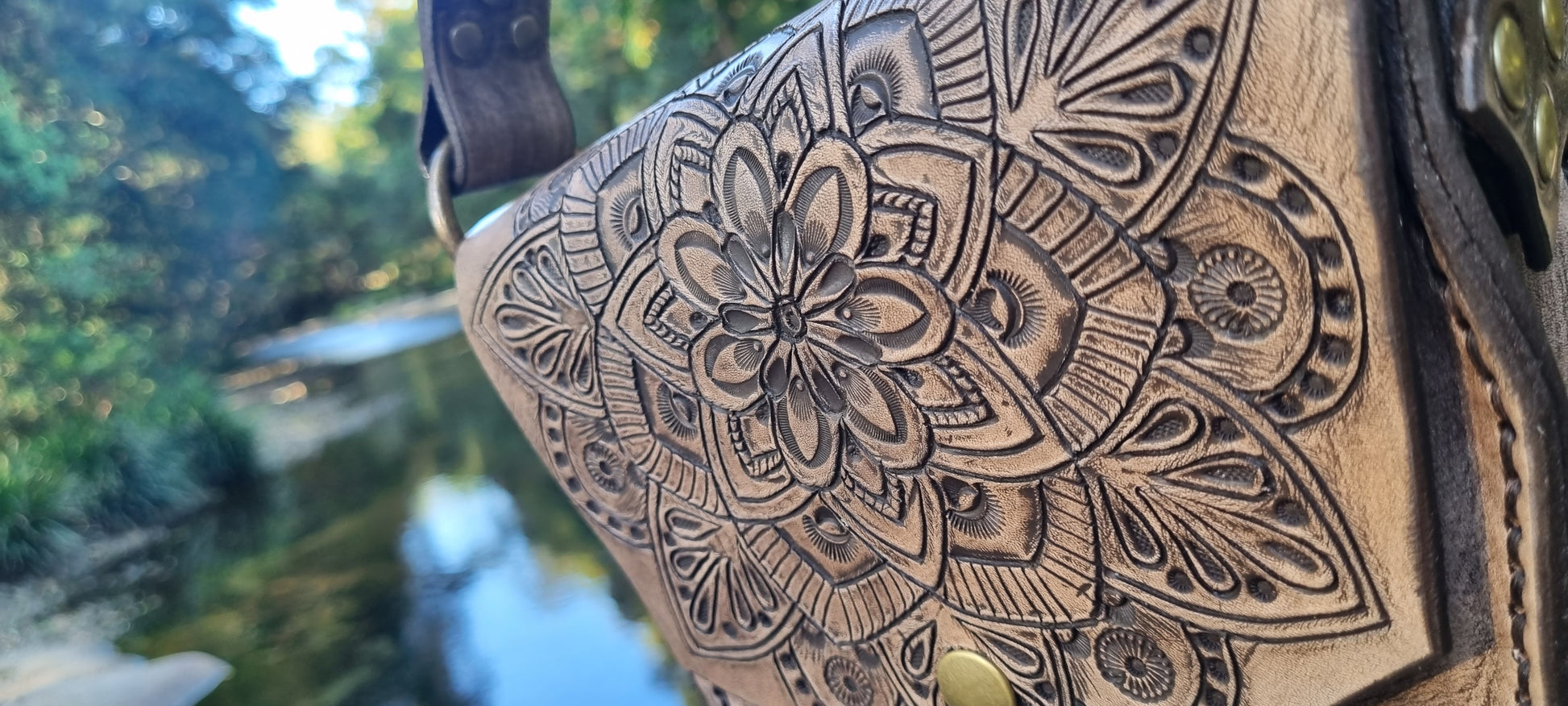 Leather handbag handmade by me in Bellingen. I have carved, stamped and dyed the feature mandala piece. Thick long lasting quality leather.