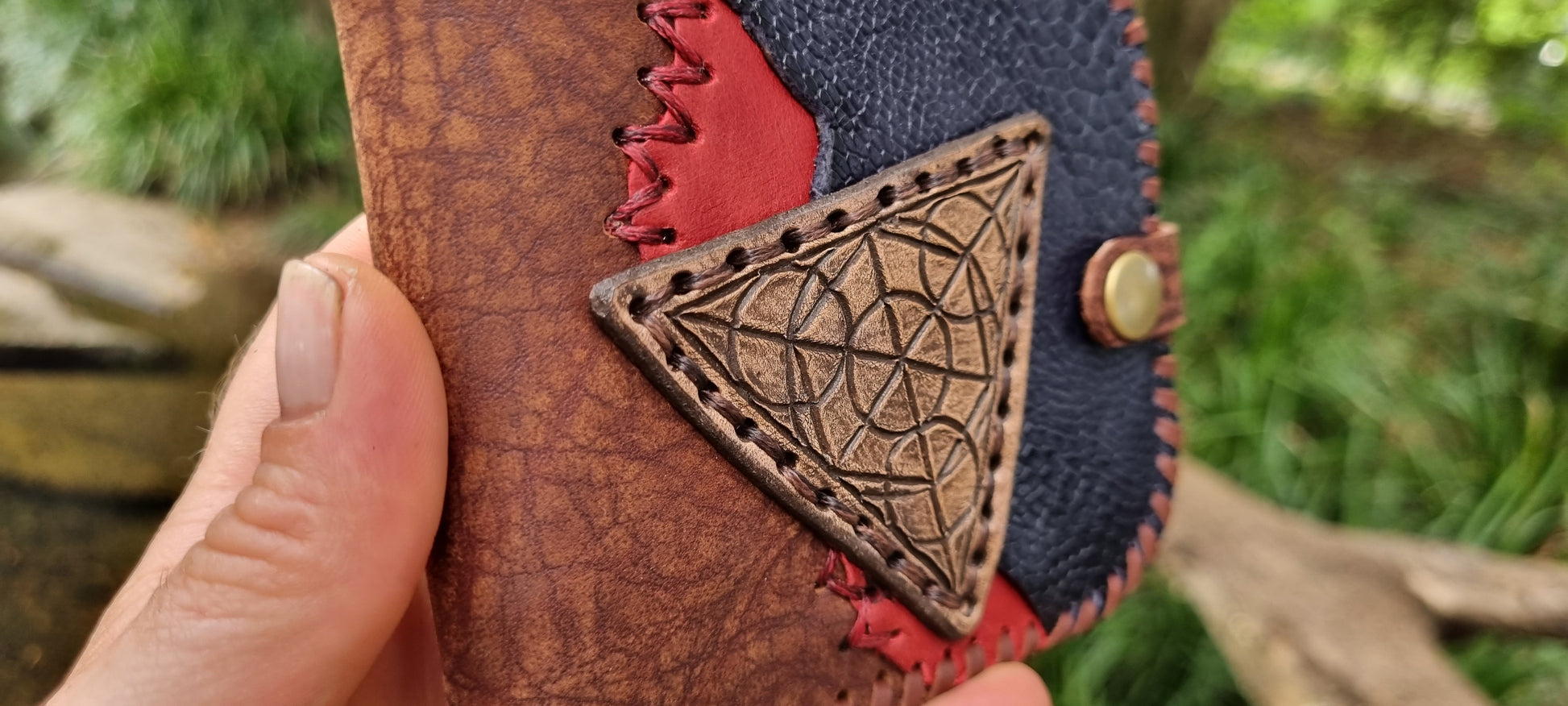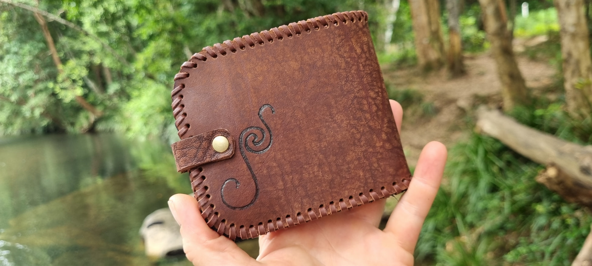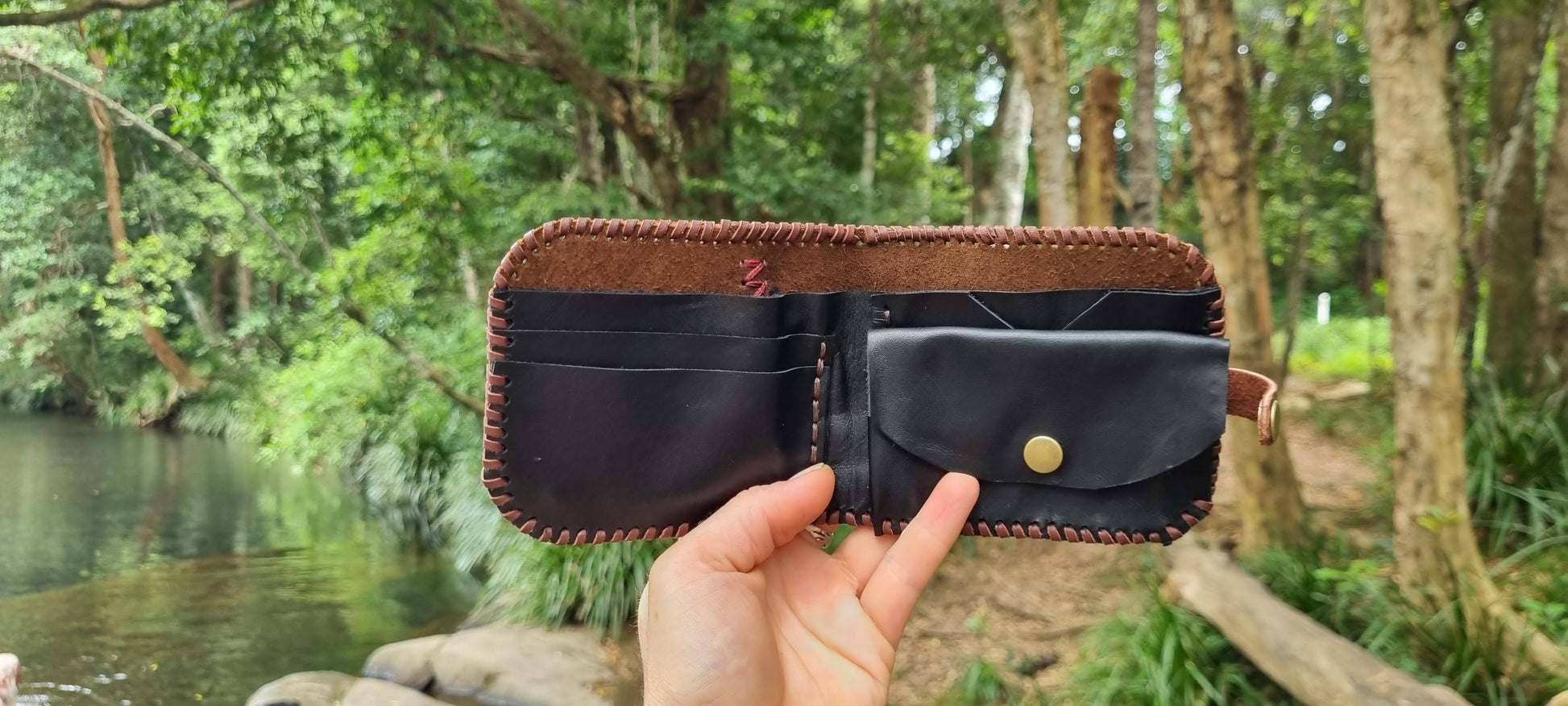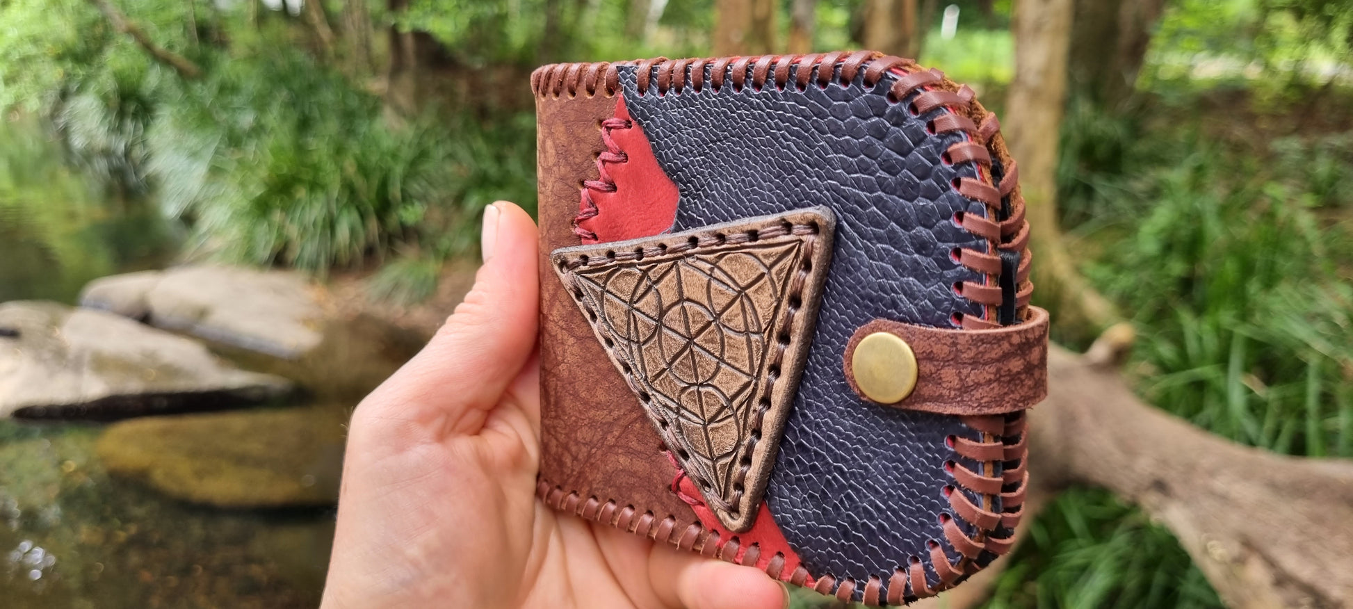 Leather wallet handmade by me in Bellingen. Hand carved and dyed feature on front with sacred emu skin. Thick quality long lasting leather. Three card holders, note section plus coin pouch.