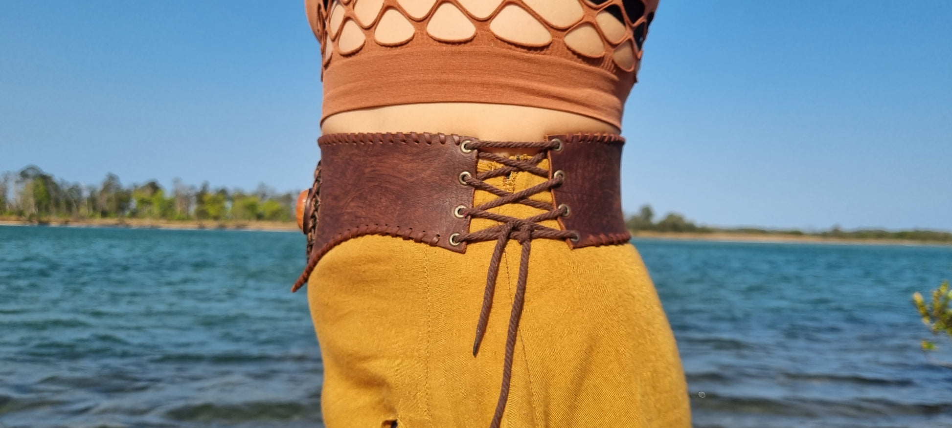 Handmade leather belt made by me in bellingen. Stone set in leather as feature, with kangaroo lacing for the trim. Slightly adjustable with lace up sides. Fits ladies 8/10 size.