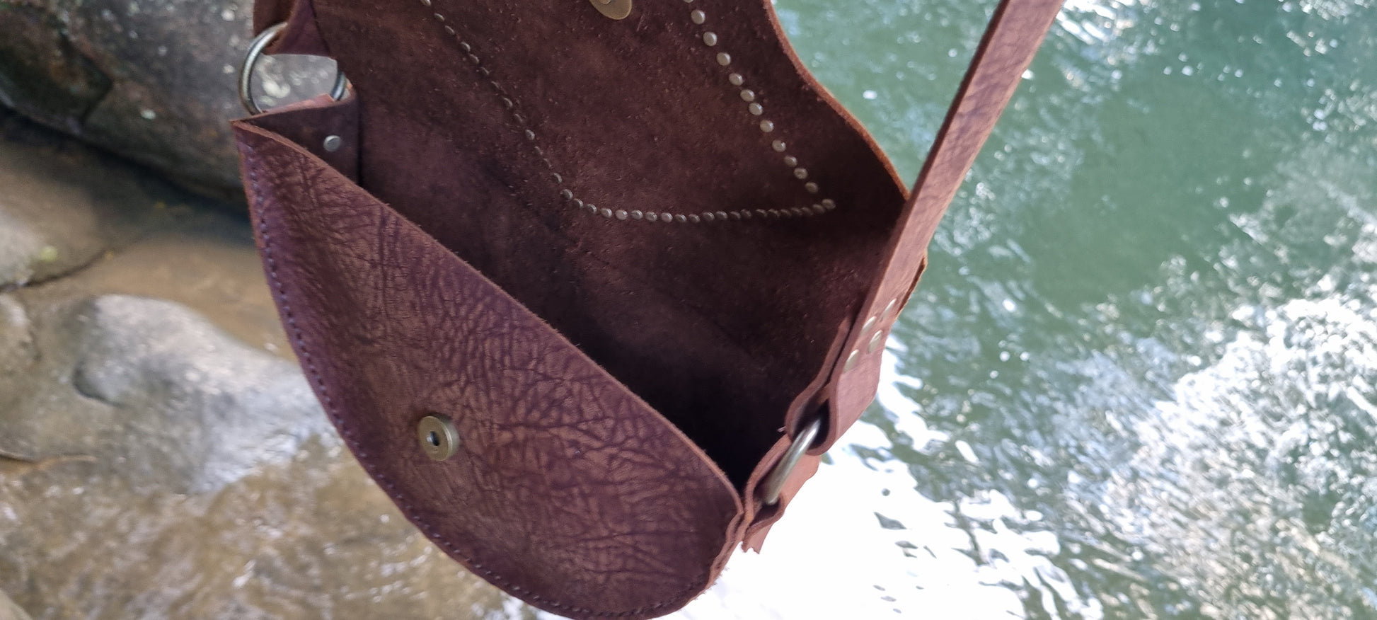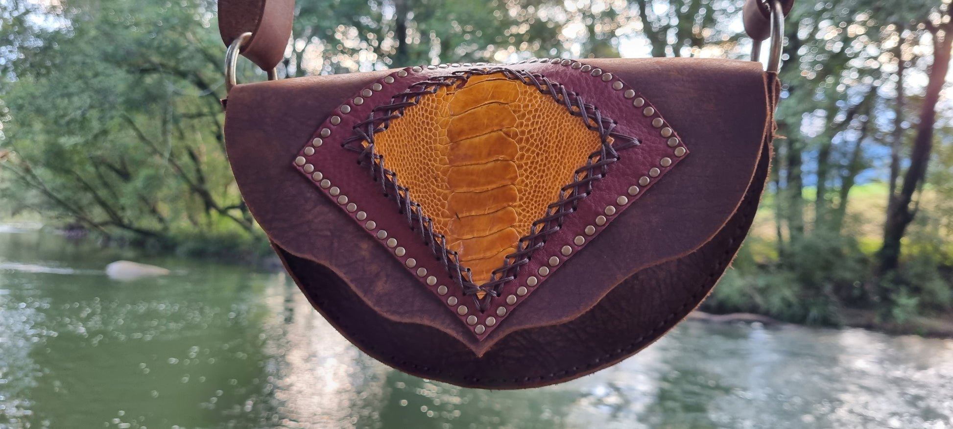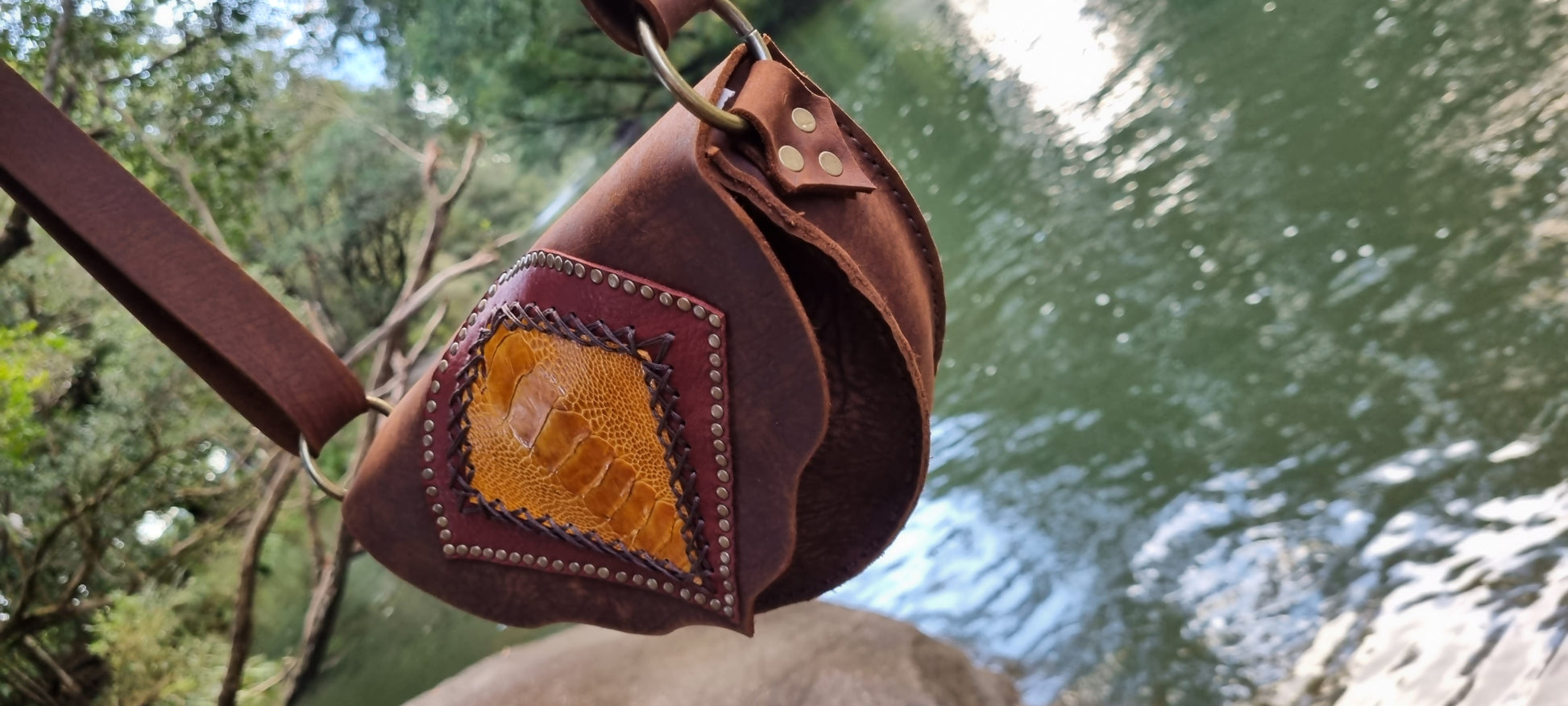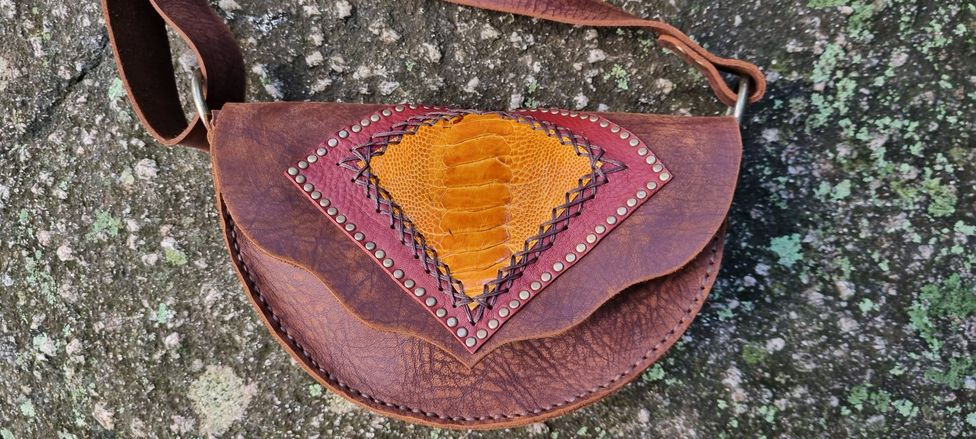 Handmade leather handbag made by me in bellingen. Strap adjustable. Single large pocket. Thick long lasting quality leather. Emu skin on front. If you like this style but want different colours or design please contact me for a custom order.