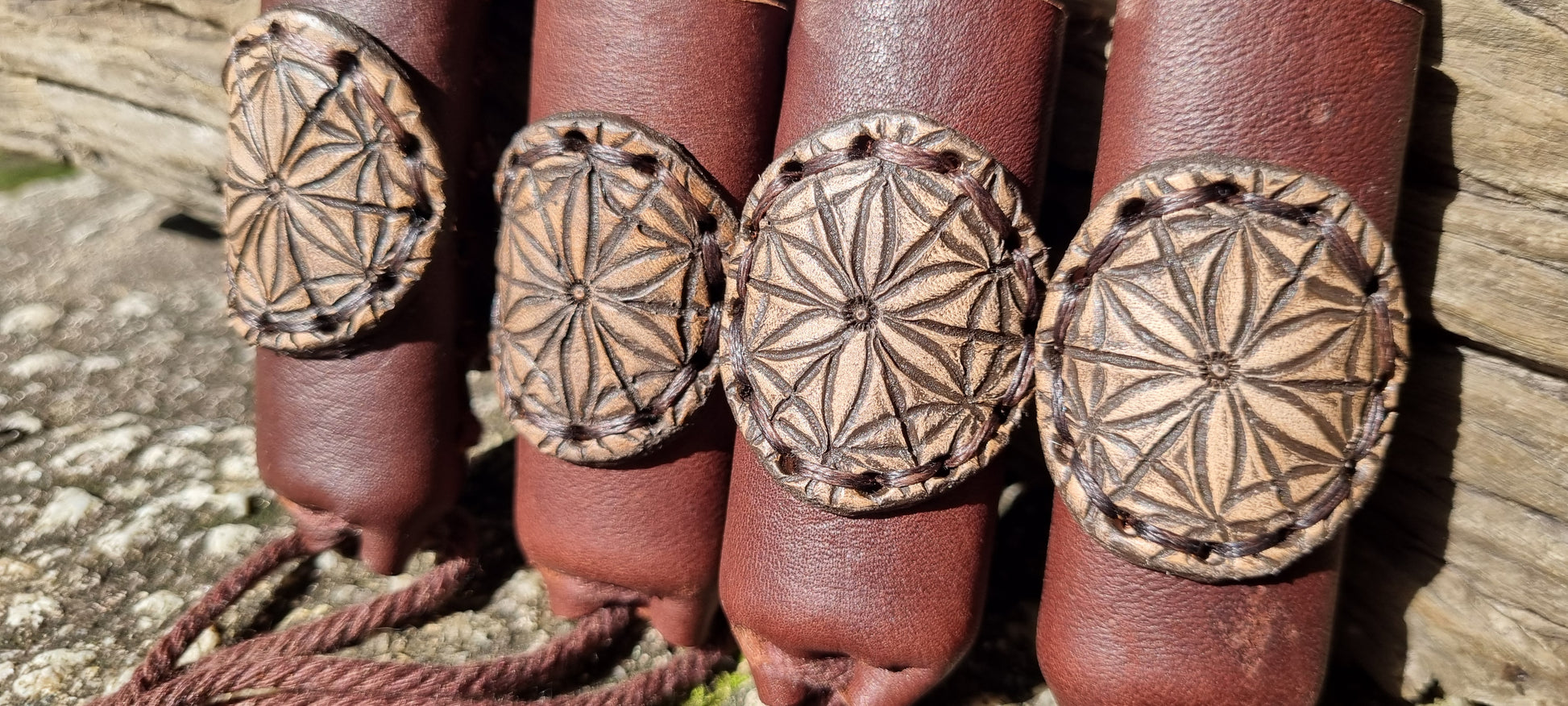 This handcrafted leather cigarette lighter case is a true work of art, featuring an intricate hand-carved sacred geometric pattern that adds depth and character. Made from high-quality leather, this lighter case offers both practicality and a unique design that stands out as a statement of personal style.