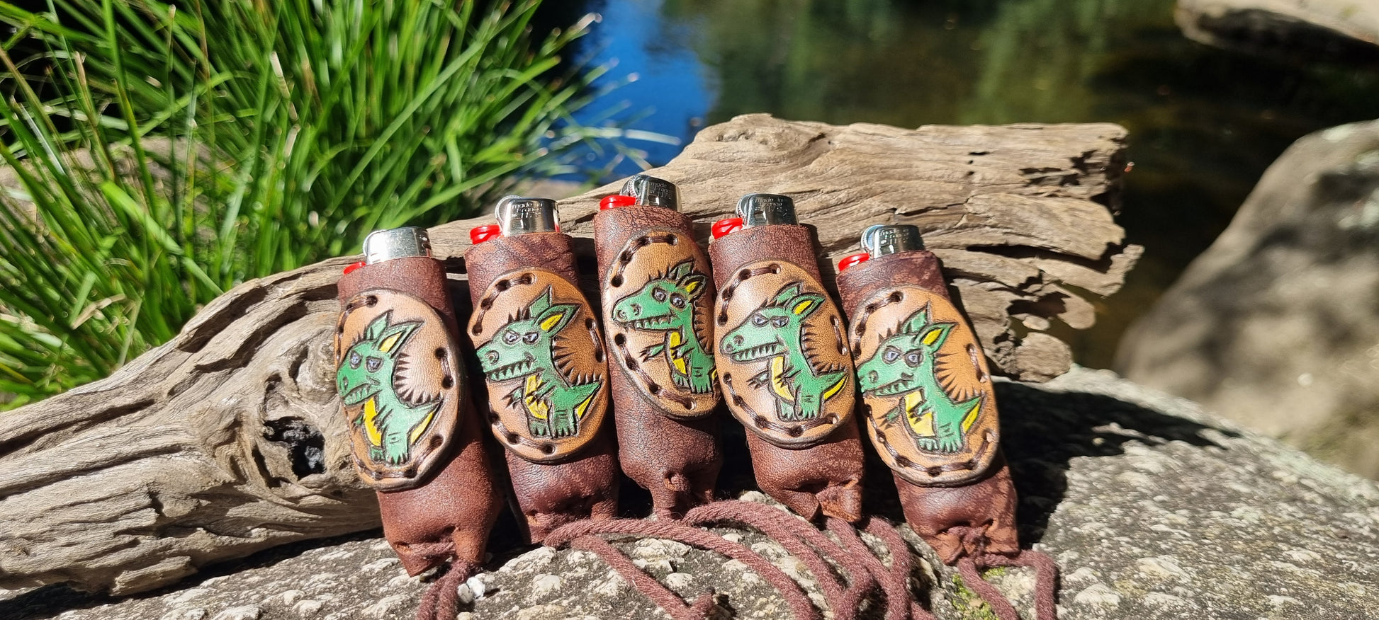 This unique handcrafted leather cigarette lighter case features a beautifully hand-carved and painted critter design on the front, making it as special as you are. Made from premium leather, this lighter case is not only practical but also showcases intricate artistry that stands out from the rest.