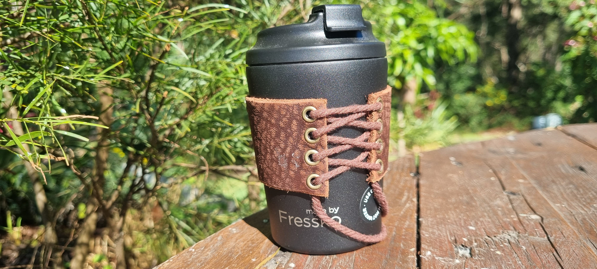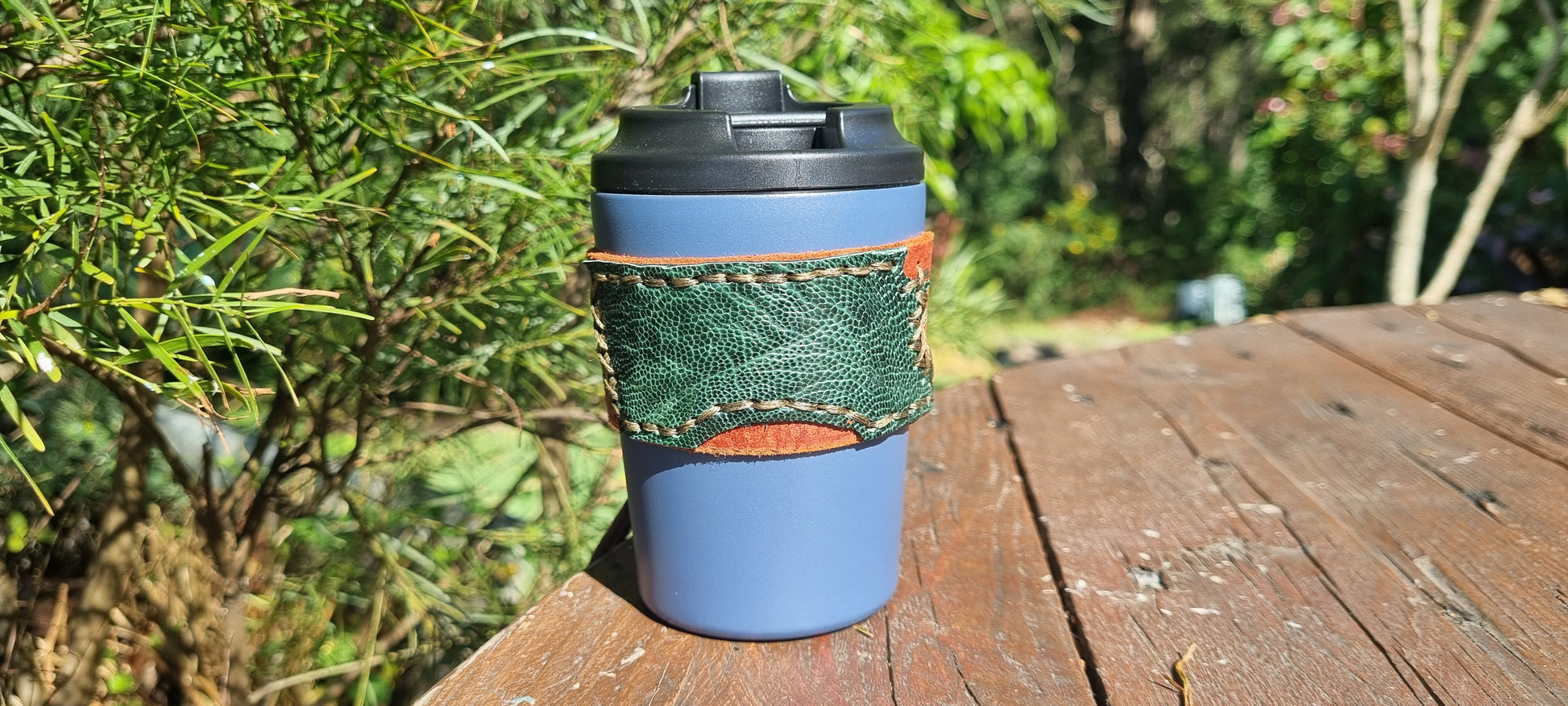 Handmade leather keep cup holder made by me in bellingen. Featuring Emu skin, think quality leather and lace up back for adjustment and secure fitting. This is a smaller size for a 8oz cup.