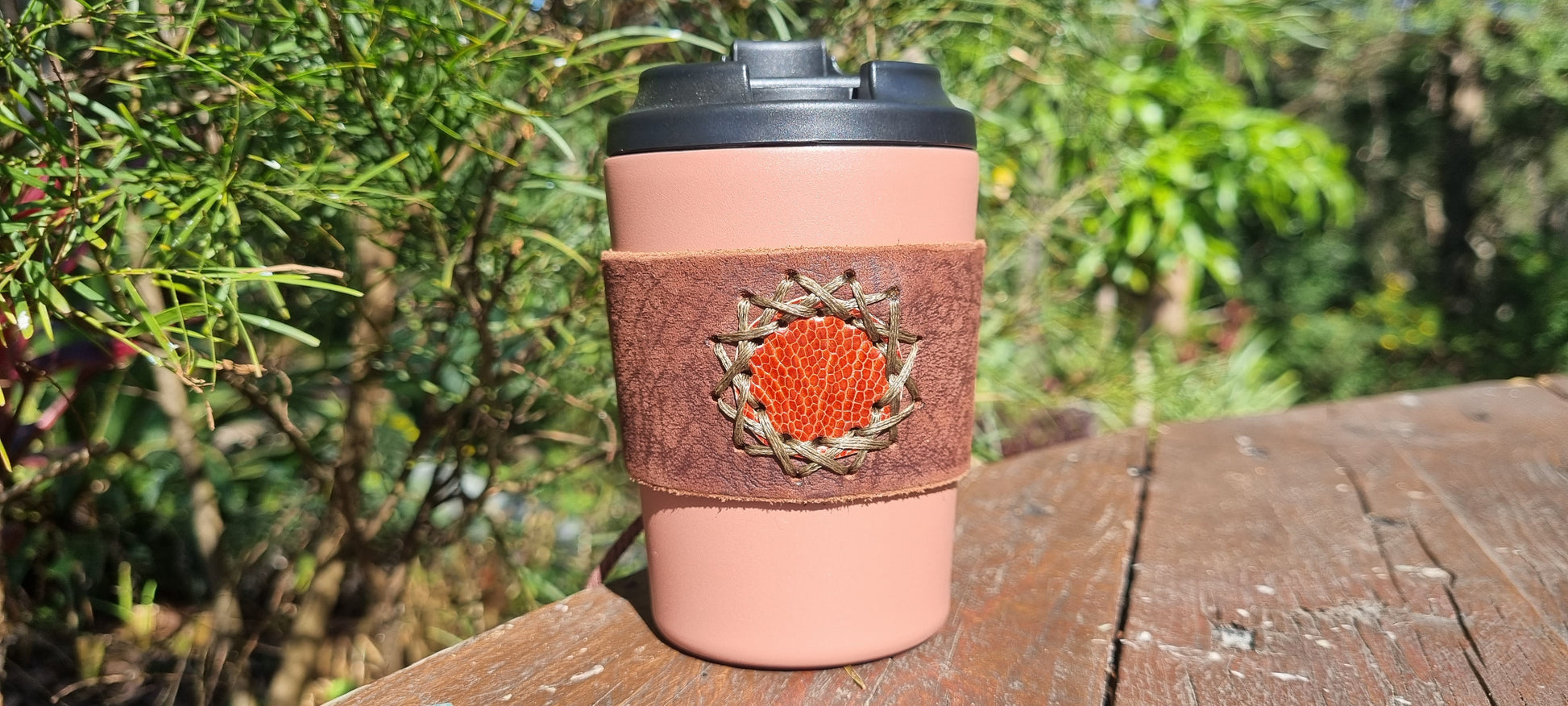 Handmade leather keep cup holder made by me in bellingen. Featuring Emu skin, think quality leather and lace up back for adjustment and secure fitting. This is a smaller size for a 8oz cup.
