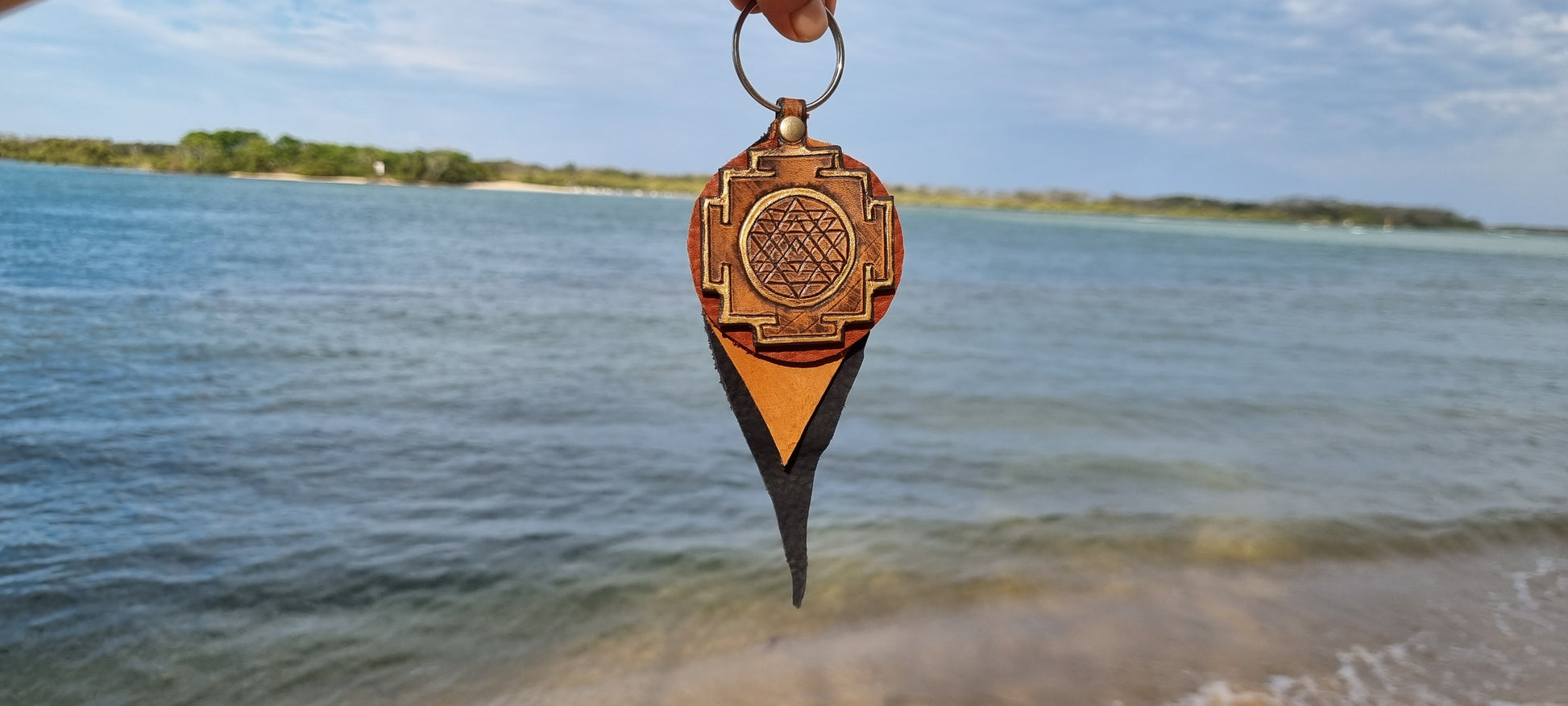 Leather keychain made by my hands in Bellingen. Design has been carved, painted and dyed.