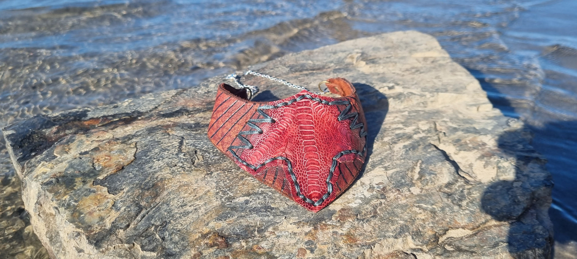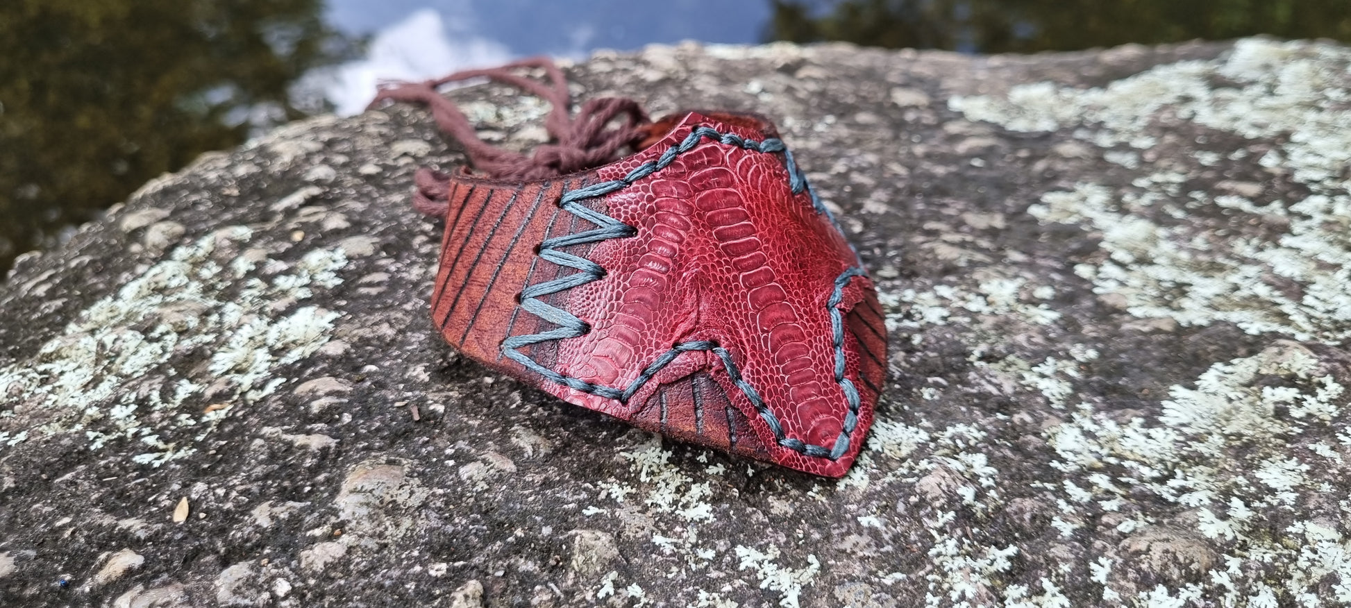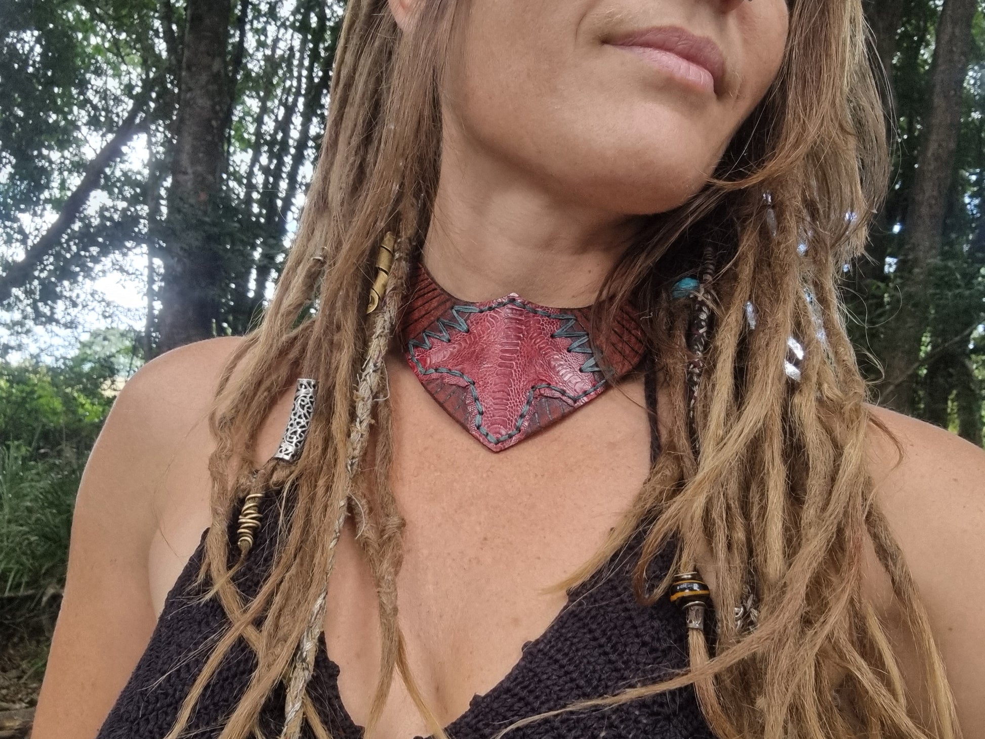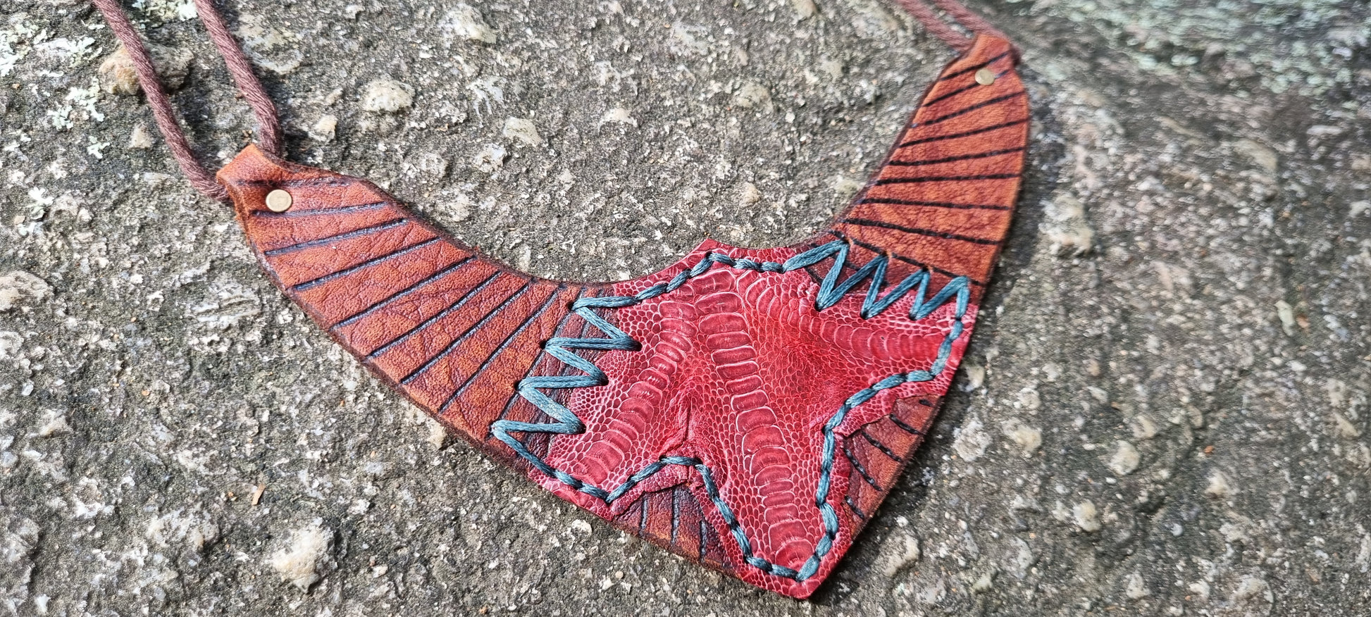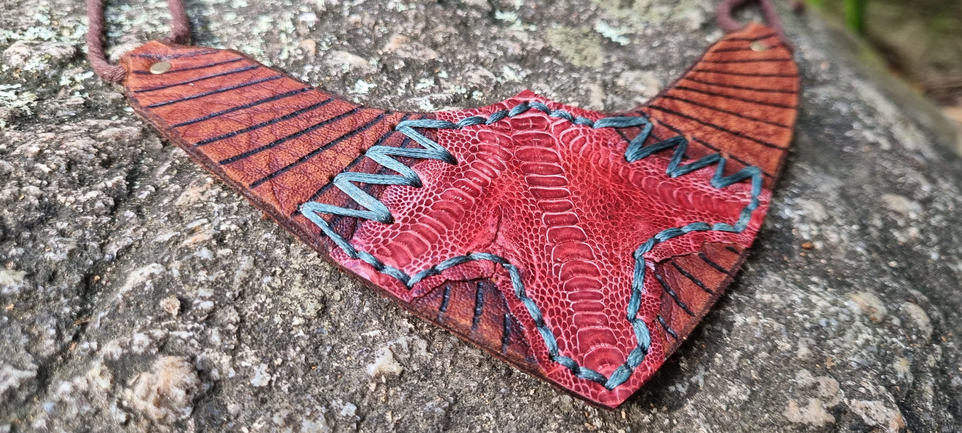 Handmade leather necklace made by me in bellingen. Featuring Turkey skin and hand burnt and stitched design.