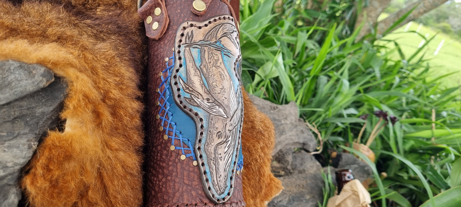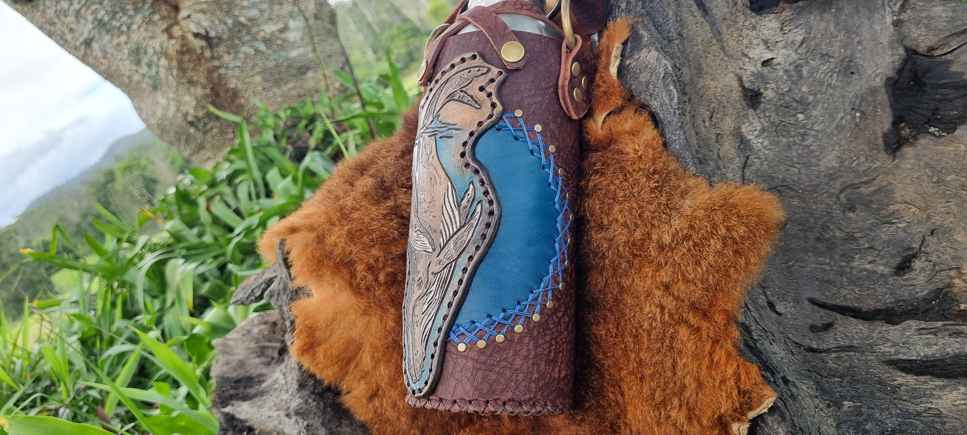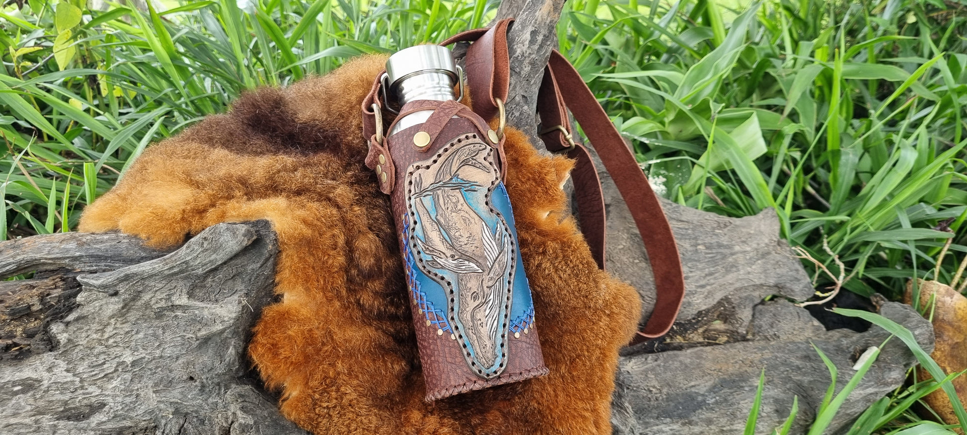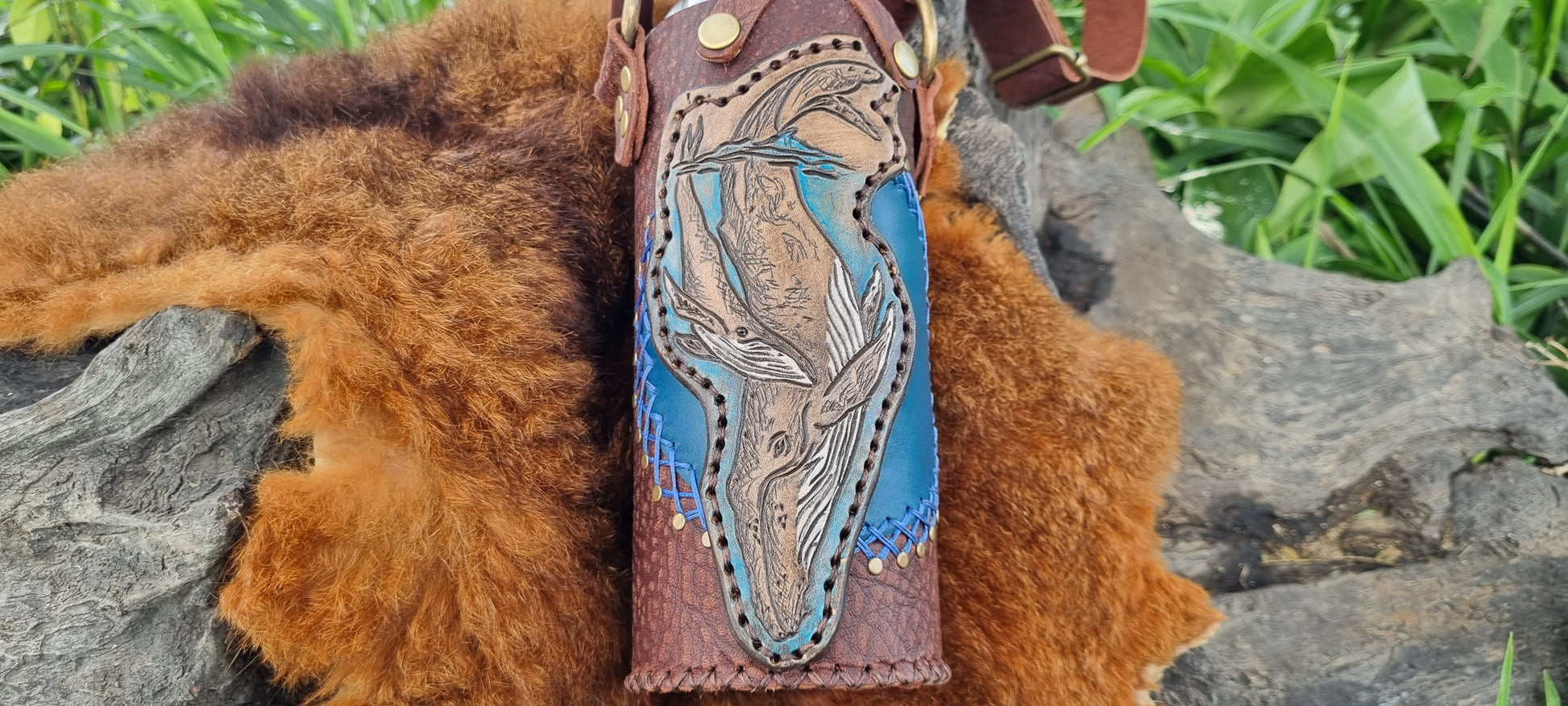 Embrace the energy of the ocean with this unique leather drink bottle holder, featuring a hand-carved whale with its baby. This design captures the majestic energy of these powerful, graceful creatures—symbolising family, protection, and deep wisdom. The intricate carvings are thoughtfully enhanced with painted details that create depth and bring the image to life, allowing you to carry a piece of the ocean’s spirit with you wherever you go. Whether you're heading to the beach, a festival, or out for a hike, this leather water bottle holder is the perfect fusion of artistic expression and everyday functionality.